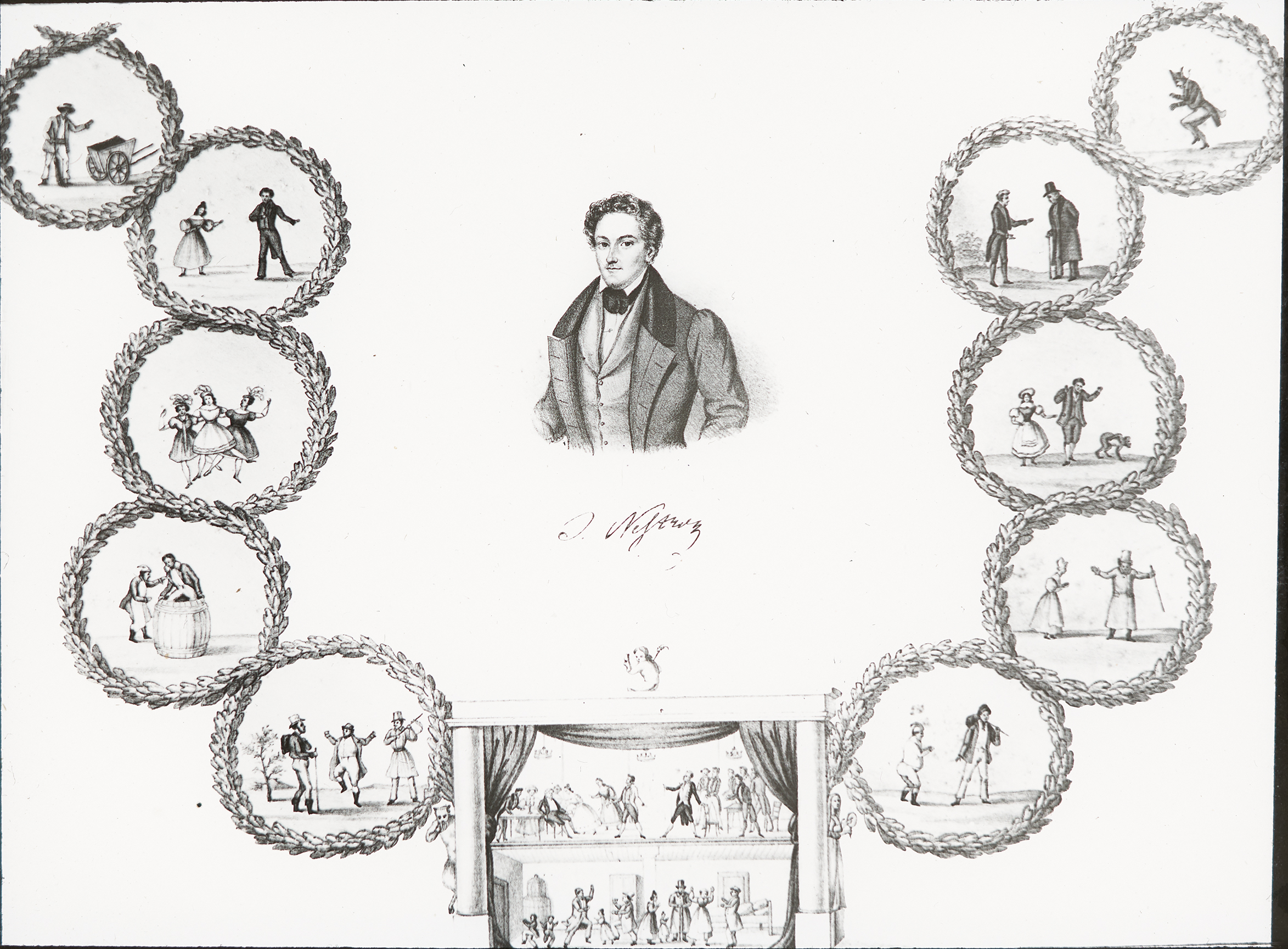 Ein Portrait von Johann Nestroy, das umrandet ist mit einzelnen Zeichnungen von Szenen aus seinen Parodien und Zauberstücken.