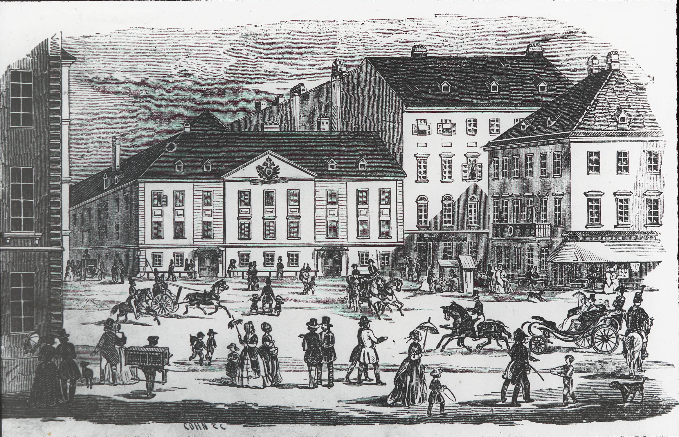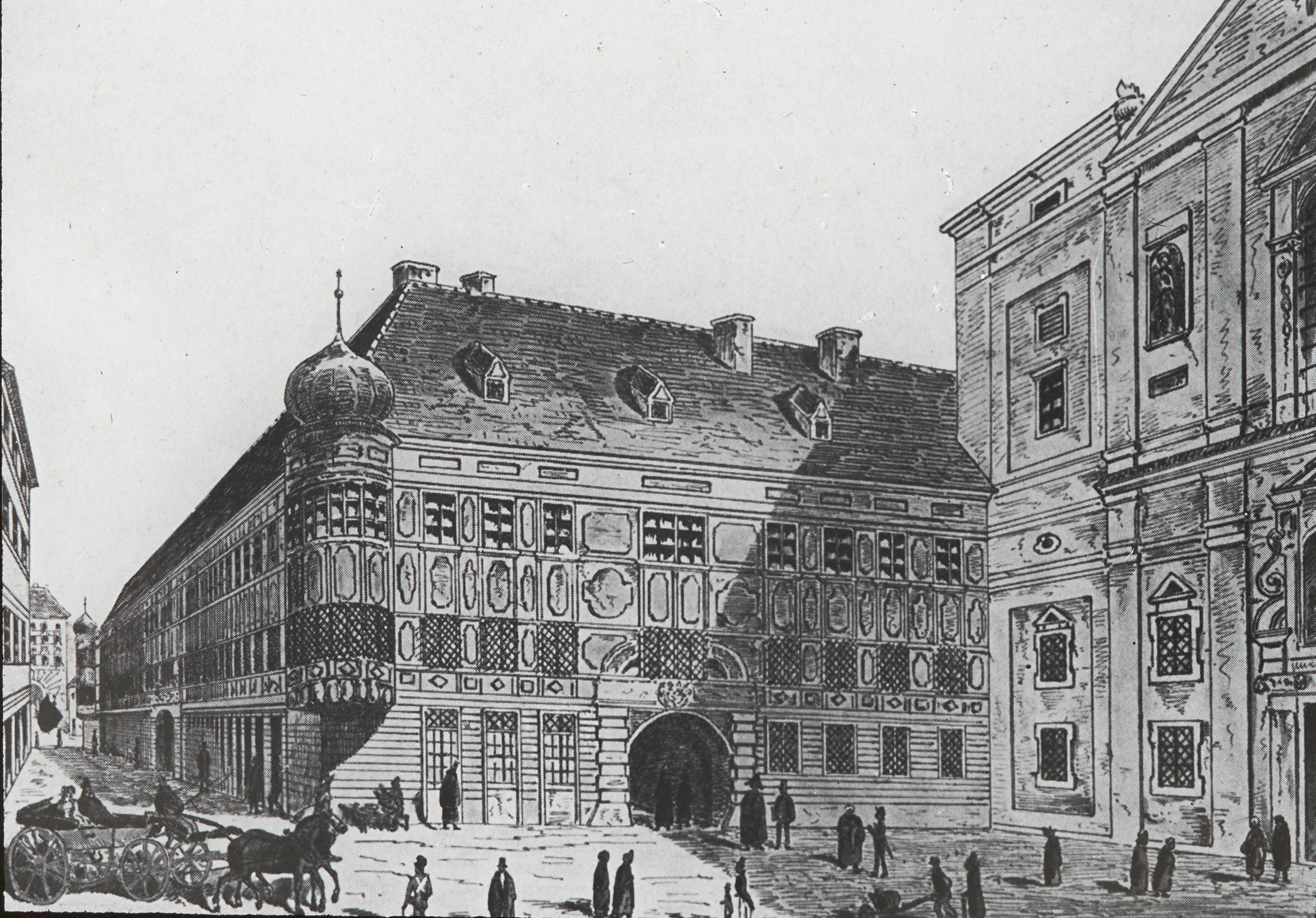 Die Zeichnung zeigt die Wiener Universität im frühen 19. Jahrhundert.