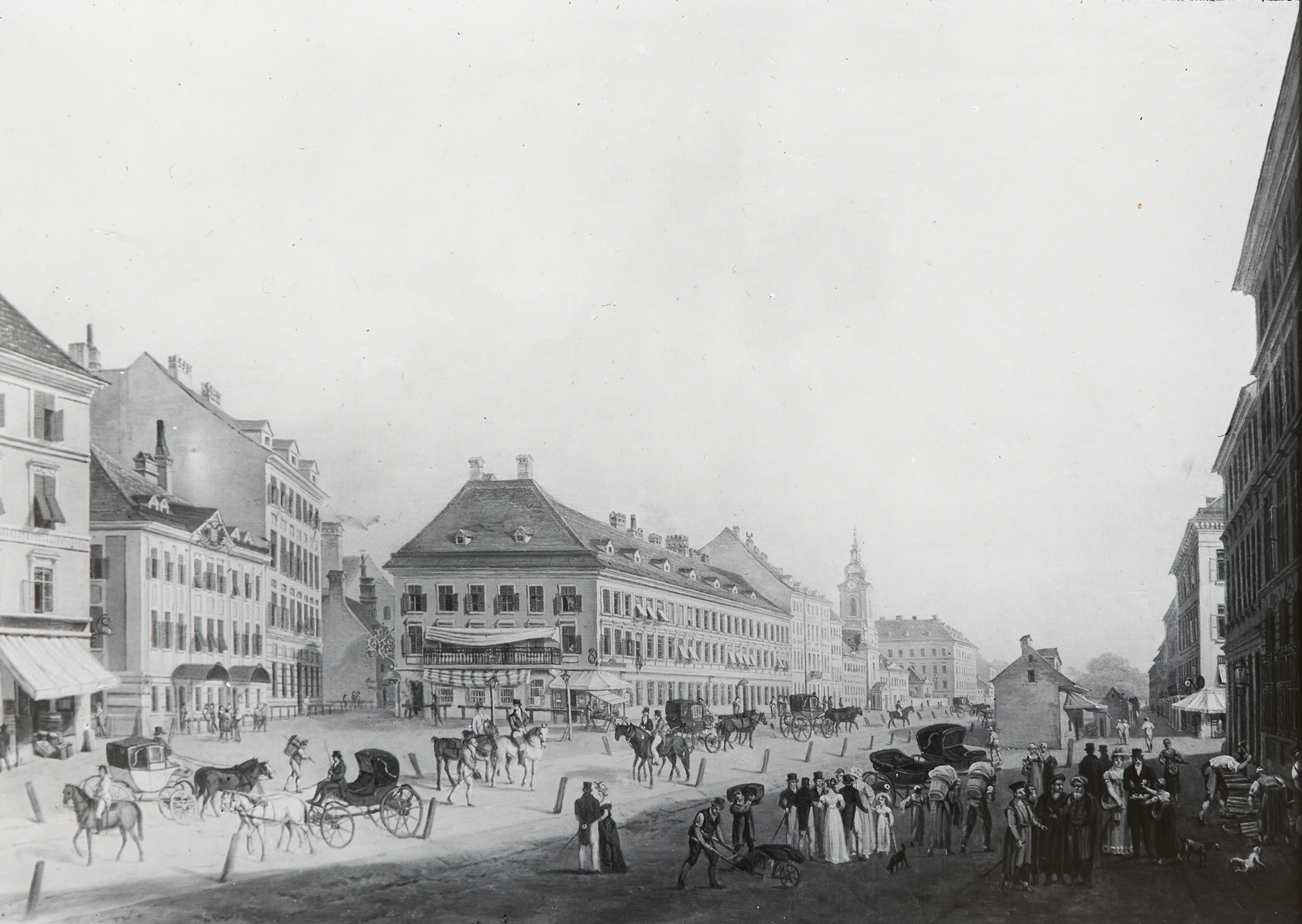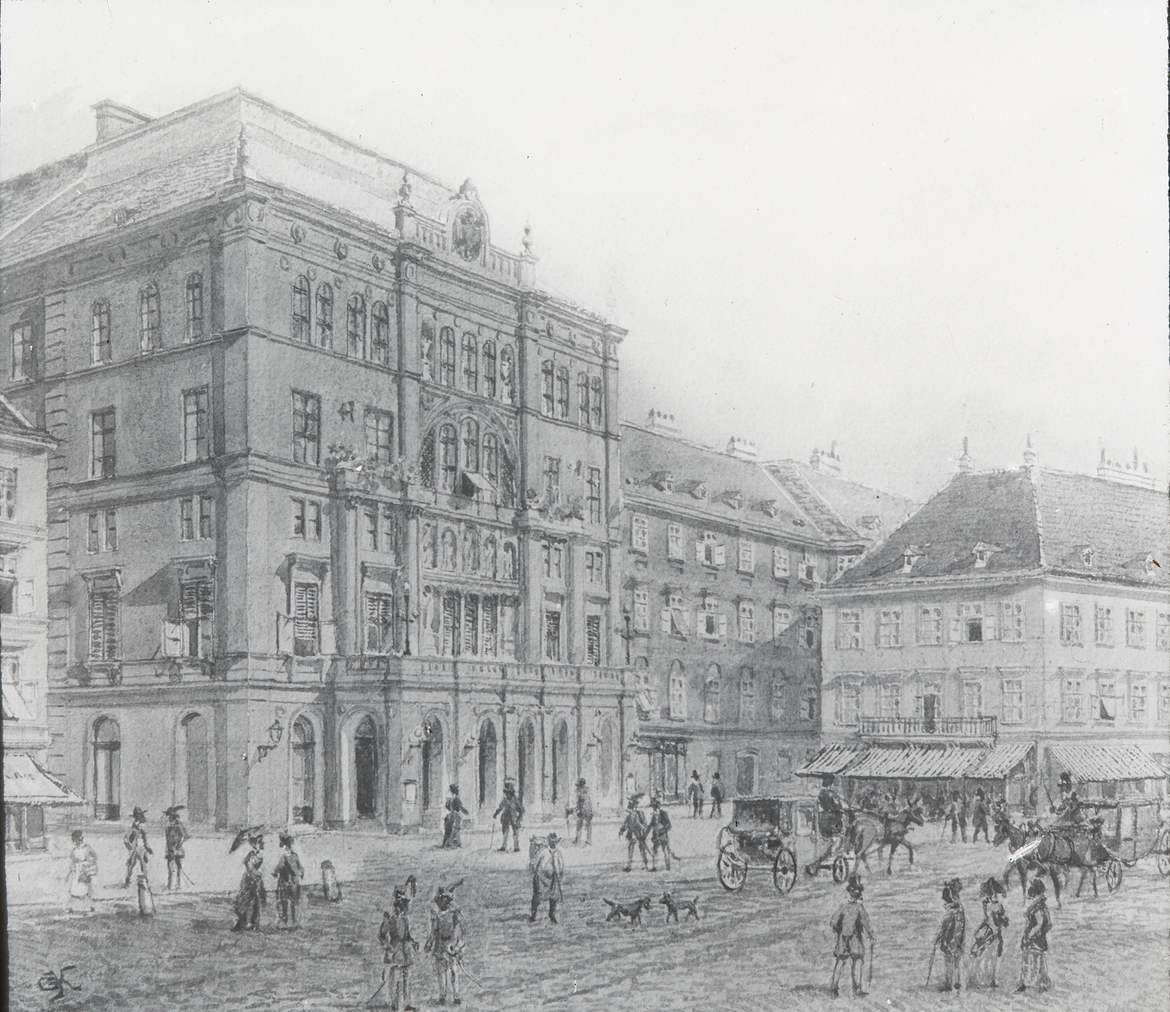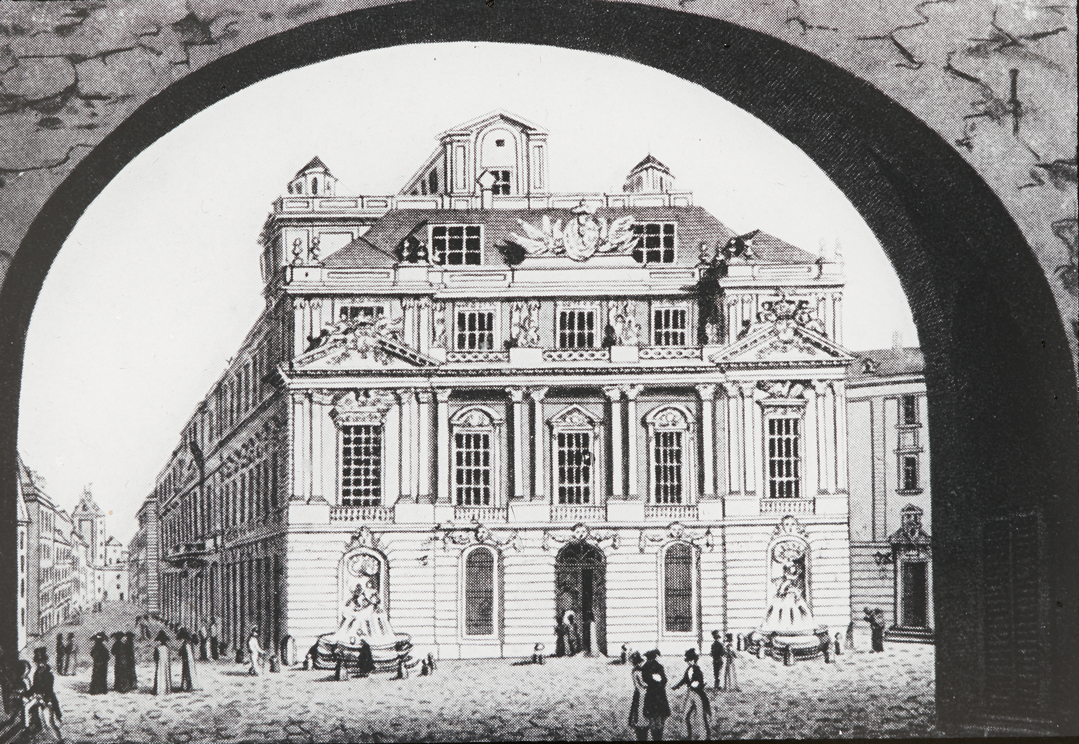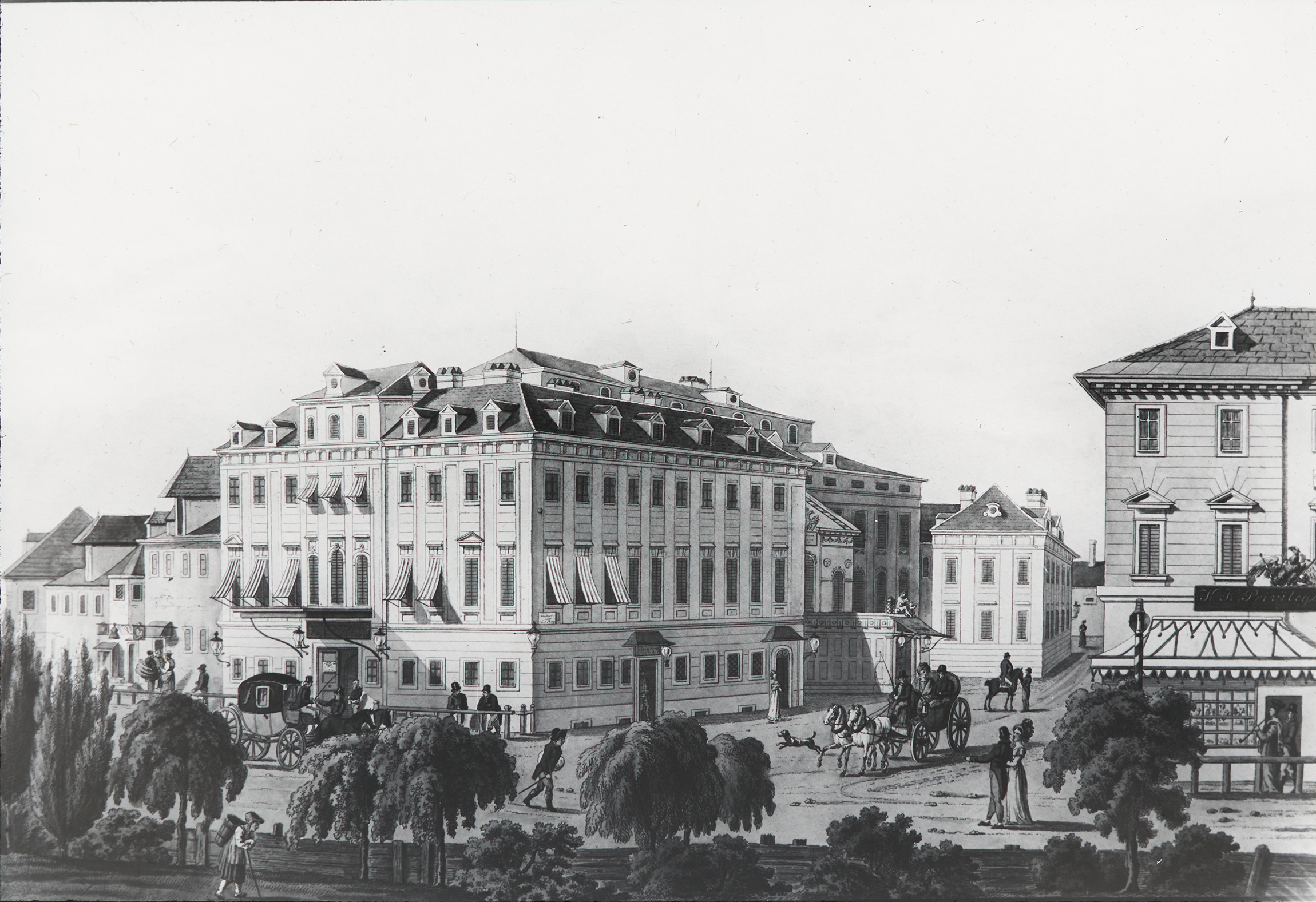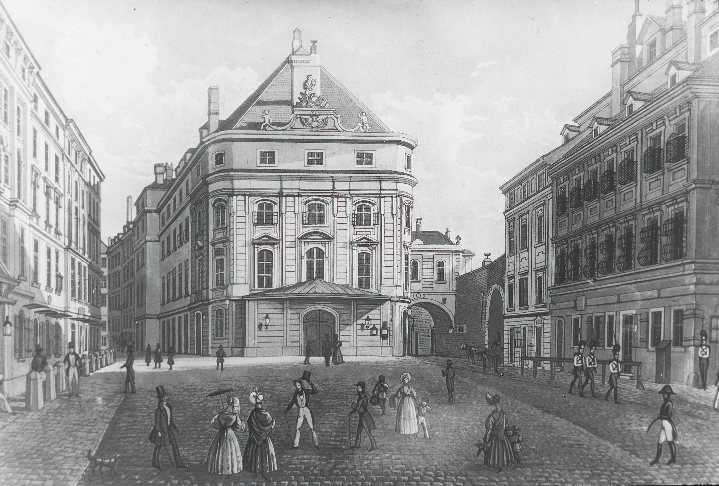 Die Außenansicht eines der Vorstadttheater Wiens, des Kärntertortheaters. Heute steht dort das Hotel Sacher.