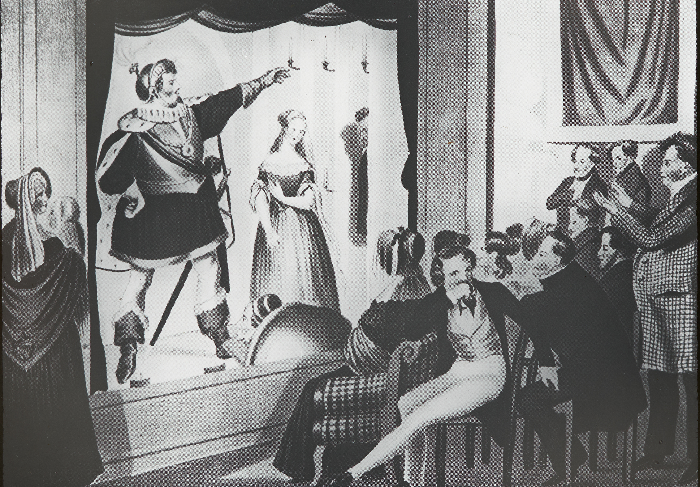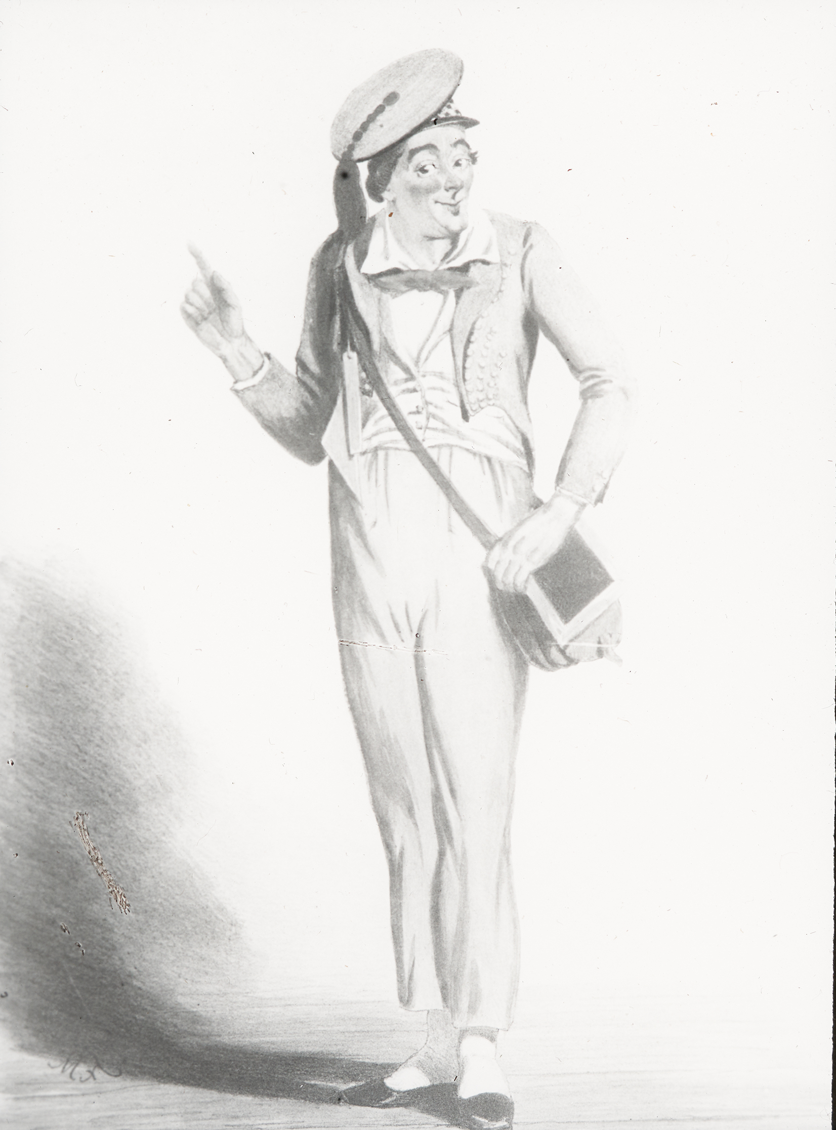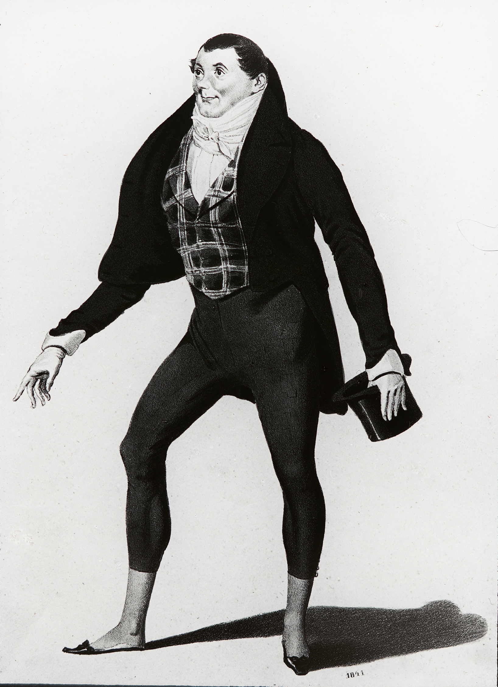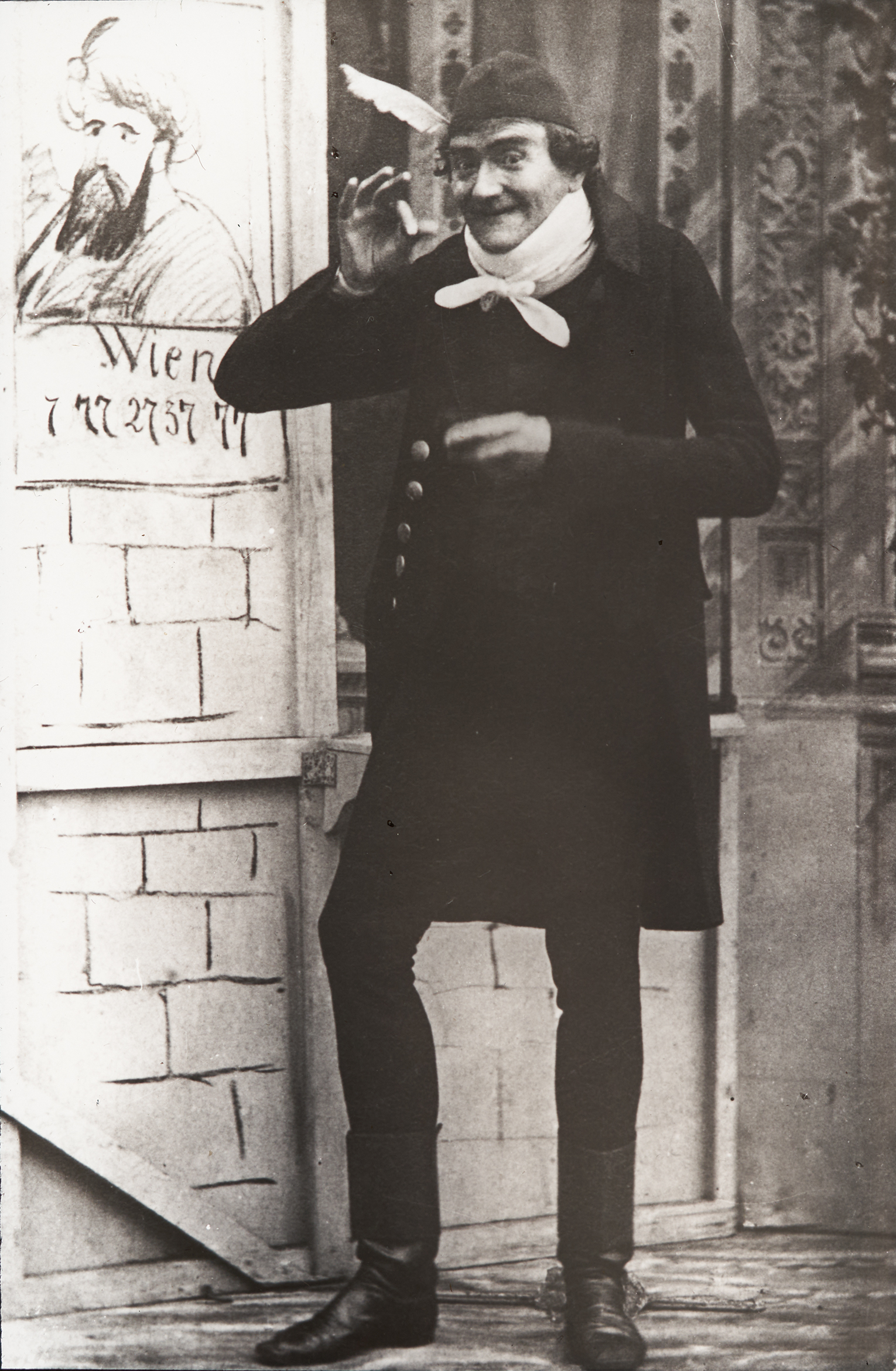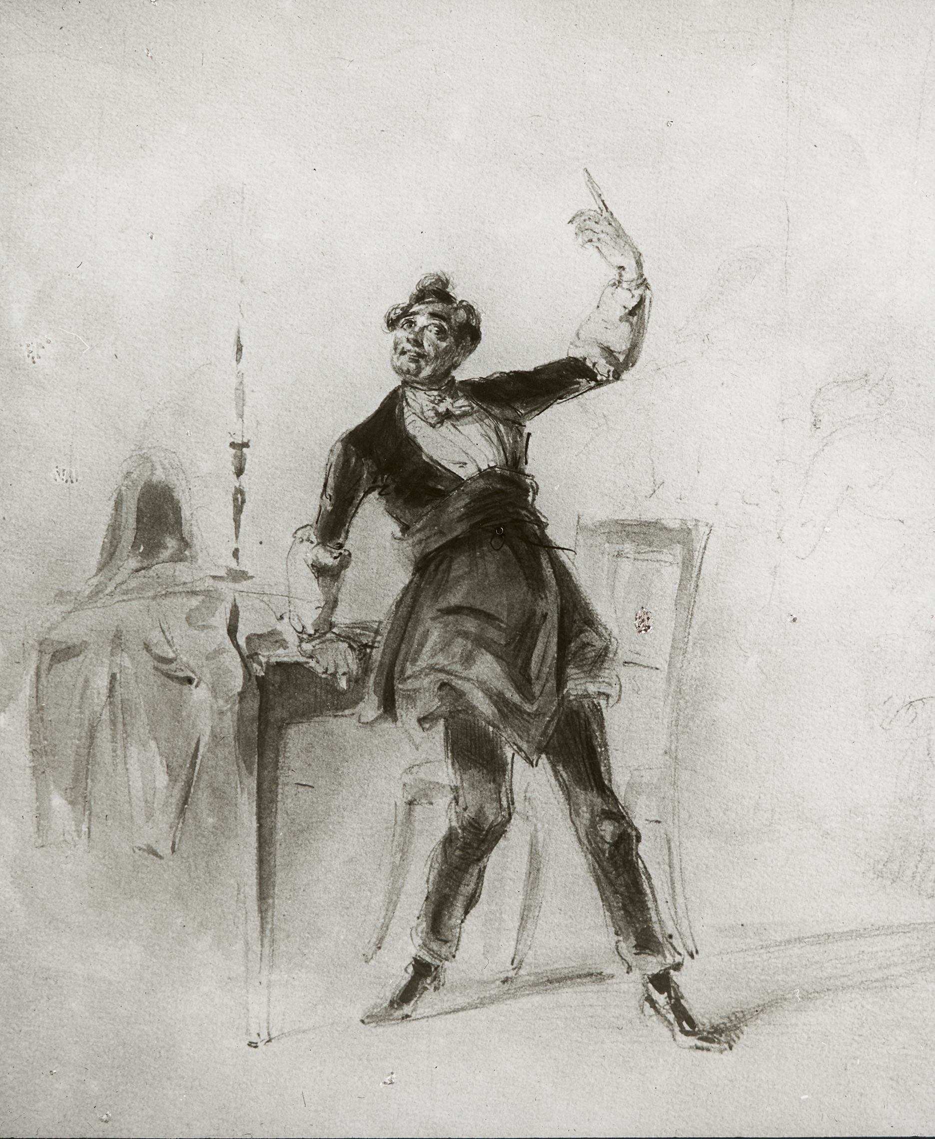 Ein Mann, vermutlich Johann Nestroy in einer seiner Theaterrollen, hebt, an einen Tisch gelehnt, seinen Zeigefinger in die Höhe.
