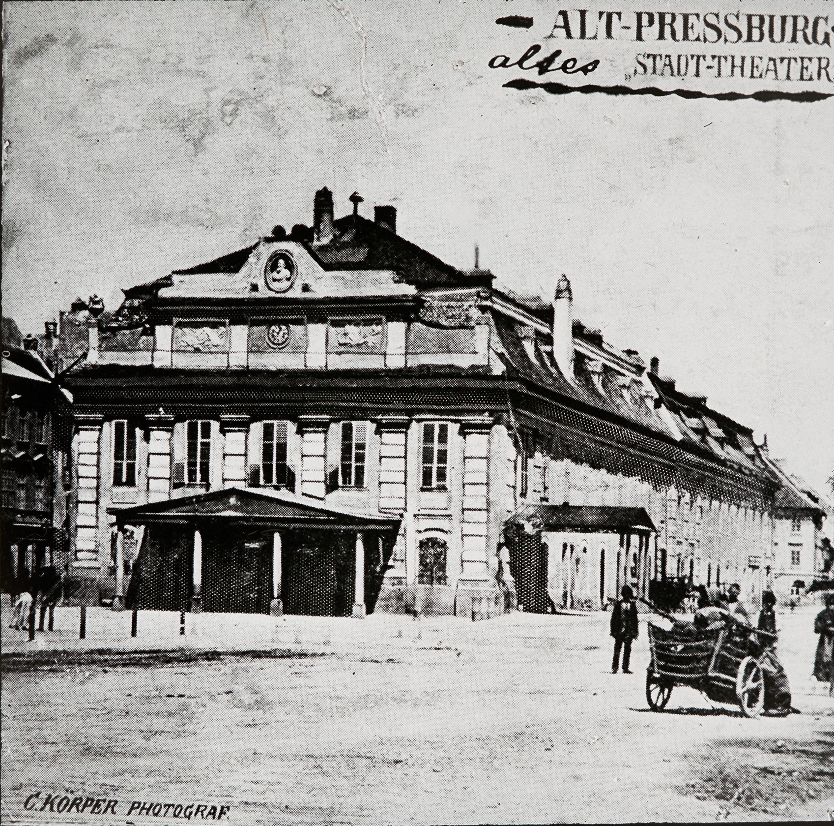 Ein Bild des Alten Stadttheater in Bratislava. Heute ist dieses Theater das Slowakische Nationaltheater, 1884 wurde das Stadttheater abgerissen und neu gebaut.