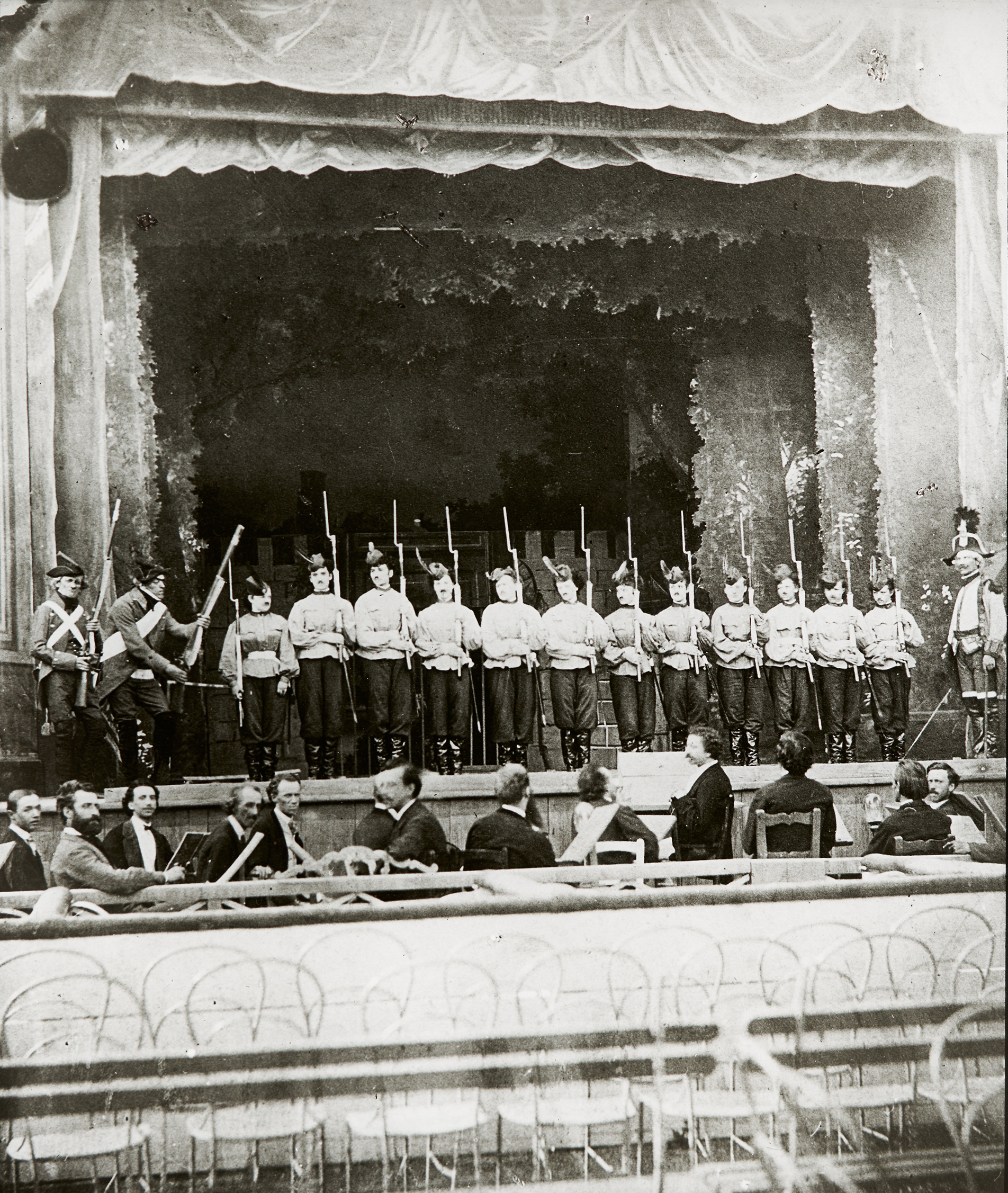 Eine Garde, die auf einer Bühne steht. Vor der Bühne sitzen Musikanten, welche Notenständer vor sich stehen haben.