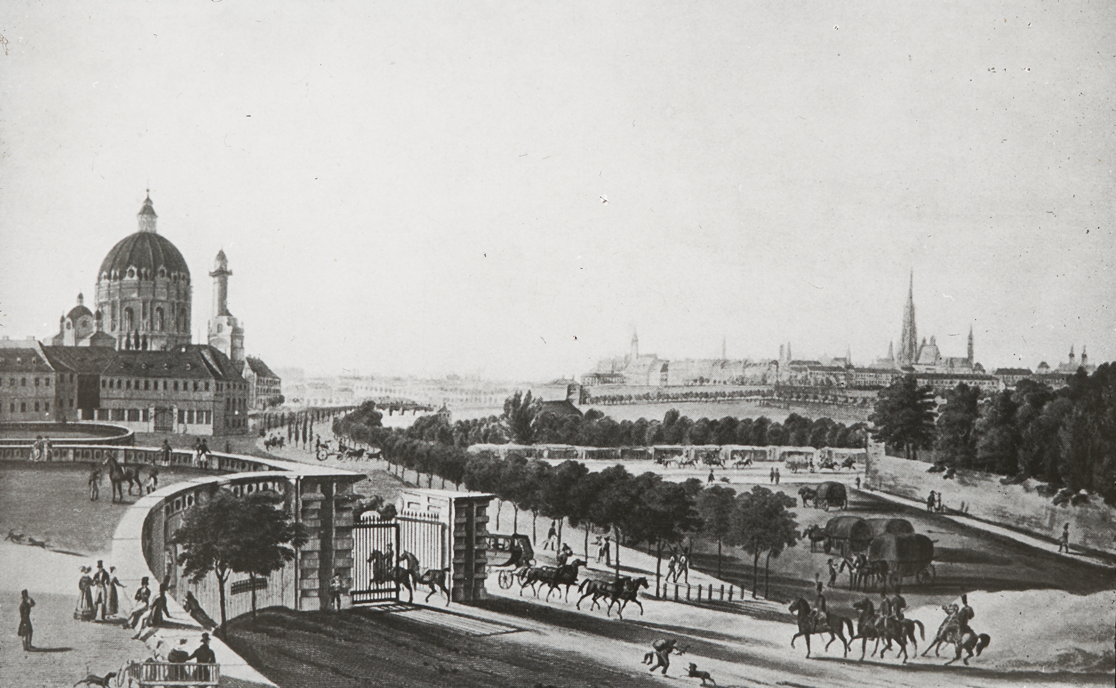Eine Zeichnung der Karlskirche aus der Ferne, aus der Perspektive der Auffahrt zum Palais Schwarzenberg.