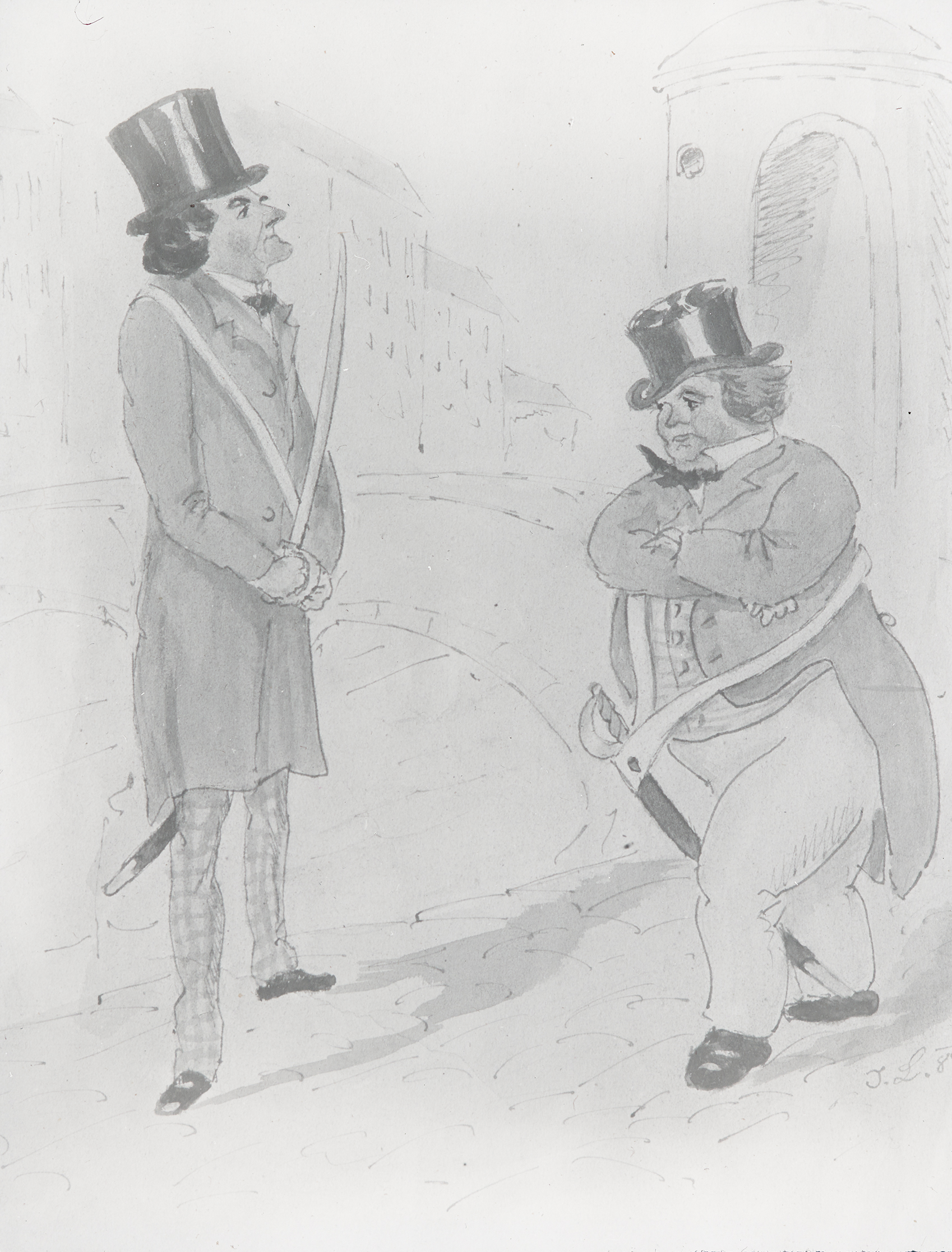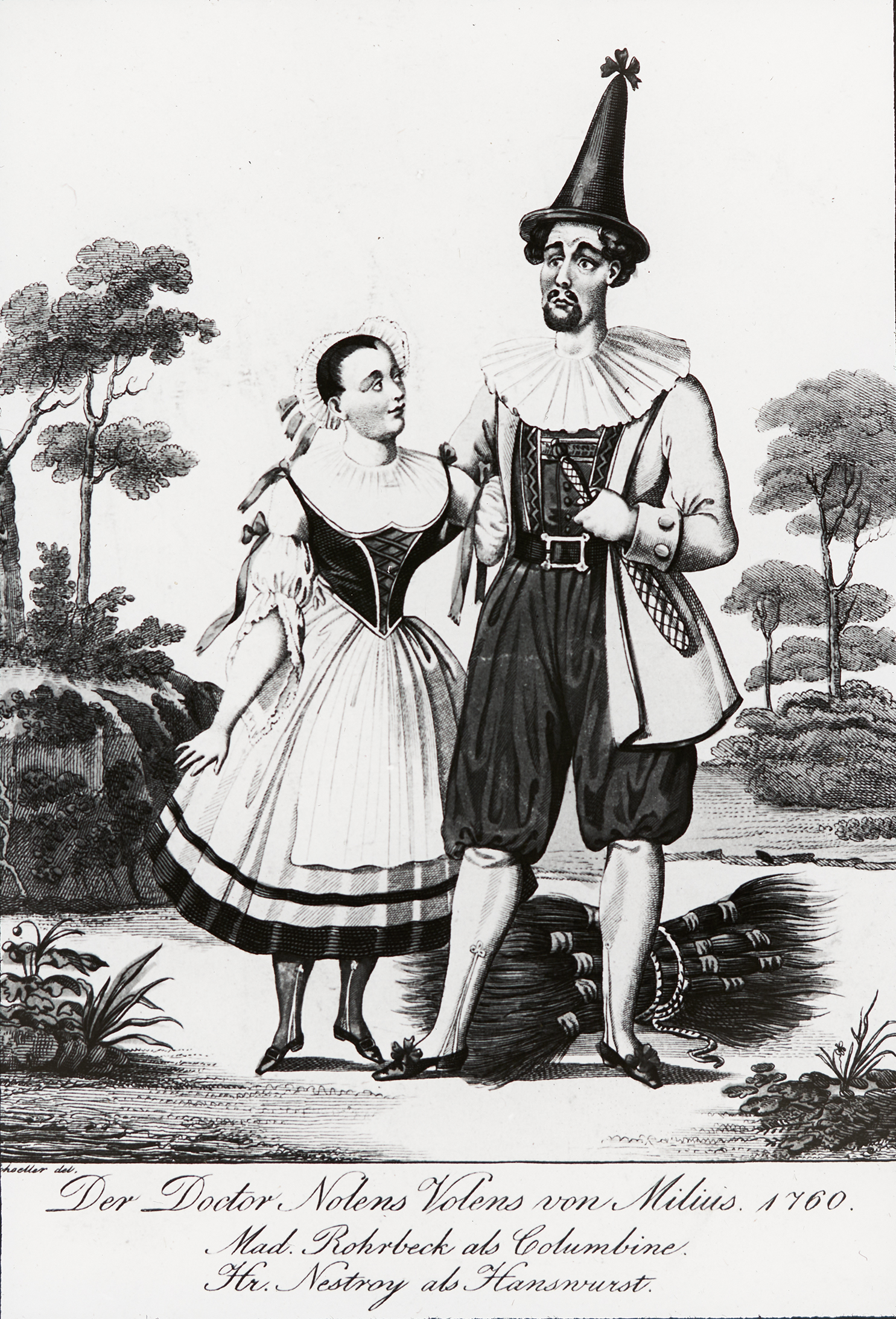 Diese Zeichnung zeigt Elise Rohrbeck in ihrer Rolle als Columbine und Nestroy als Hanswurst.