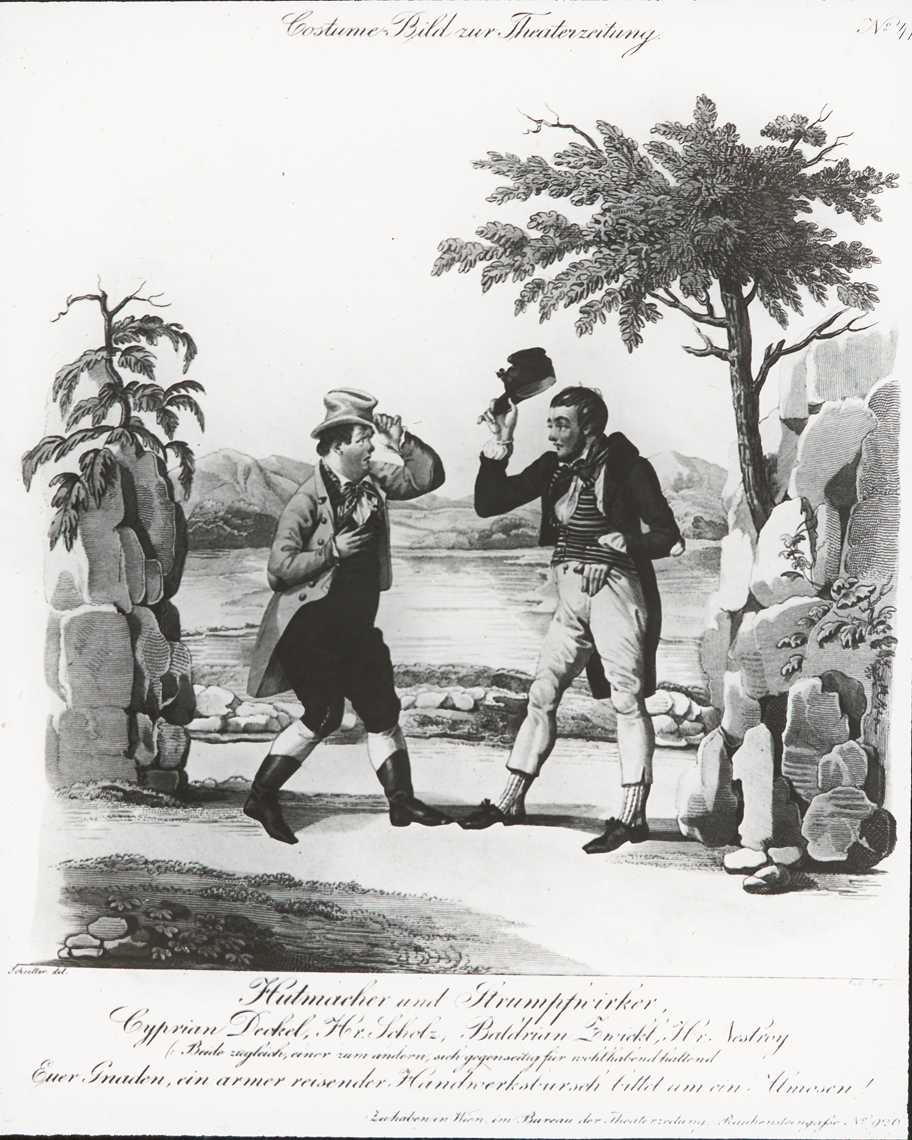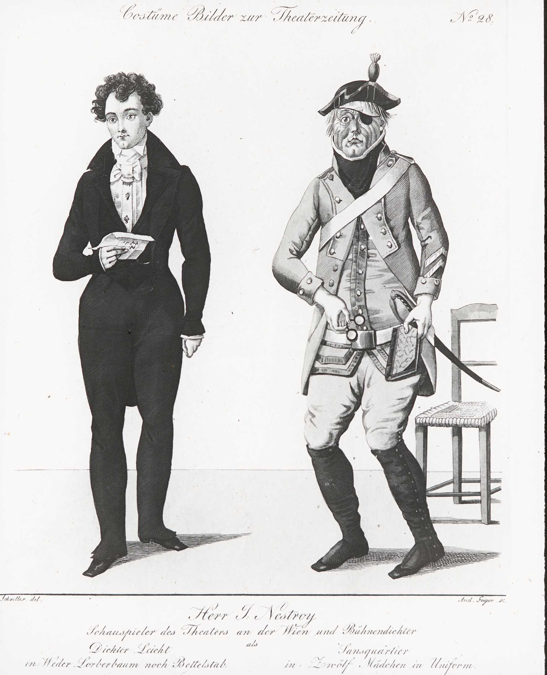 Links ist Johann Nestroy abgebildet als Dichter Leicht in "Weder Lorberbaum noch Bettelstab", ein Stück aus dem Jahr 1835, geschrieben von Nestroy. Rechts ist Nestroy zu sehen in seiner Rolle als Sansquartier in "Zwölf Mädchen in Uniform", ein Stück von Louis Angely und Johann Nestroy.