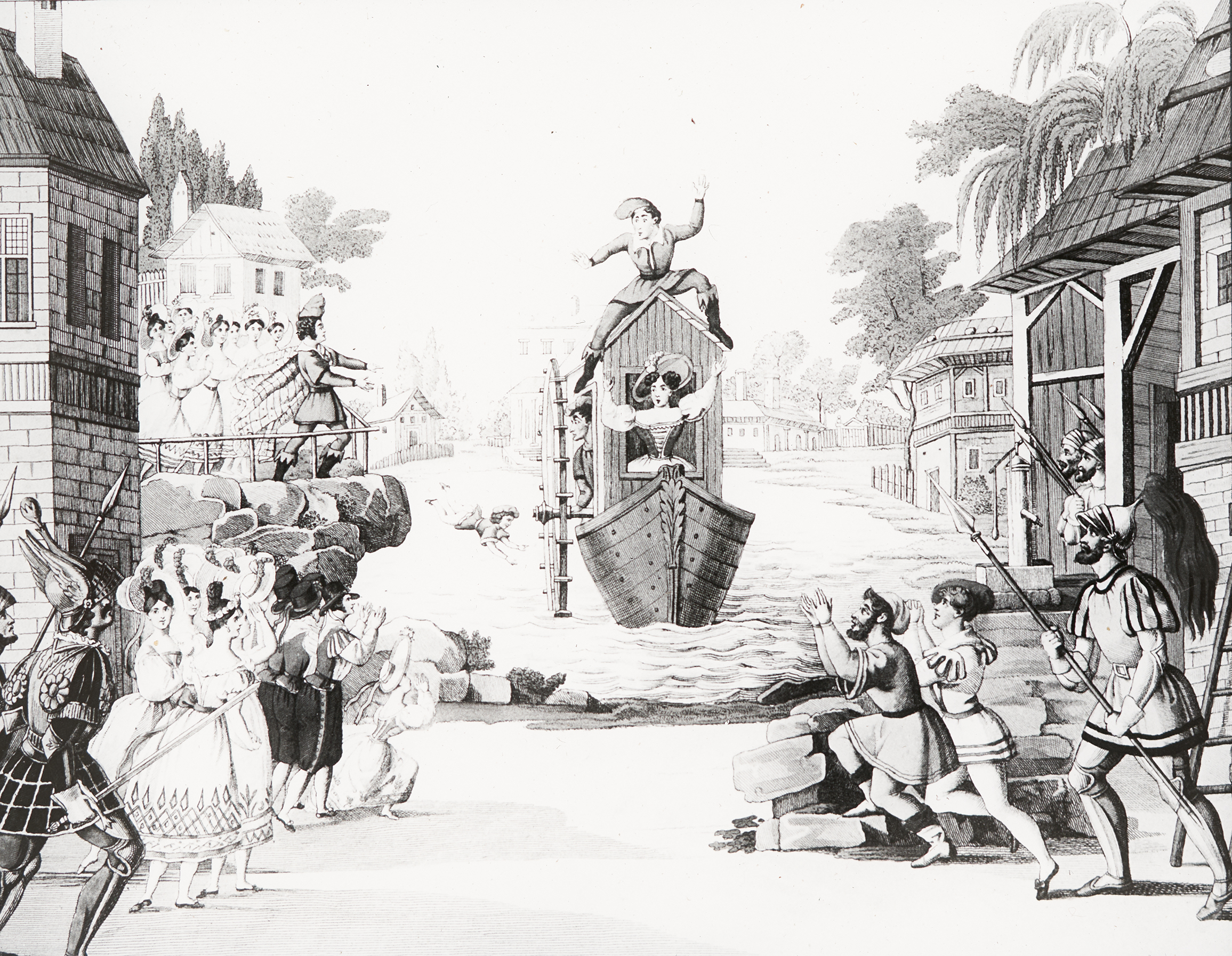 Erschienen in der "Gallerie interessanter und drolliger Scenen", zeigt dieser Kupferstich eine Szenerie aus "Adelheid, der verfolgte Wittib oder der gutmütige Kerker", einem Stück von Johann Nestroy. Die Zauberposse in drei Akten wurde am 7. Februar 1832 am Theater an der Wien uraufgeführt.