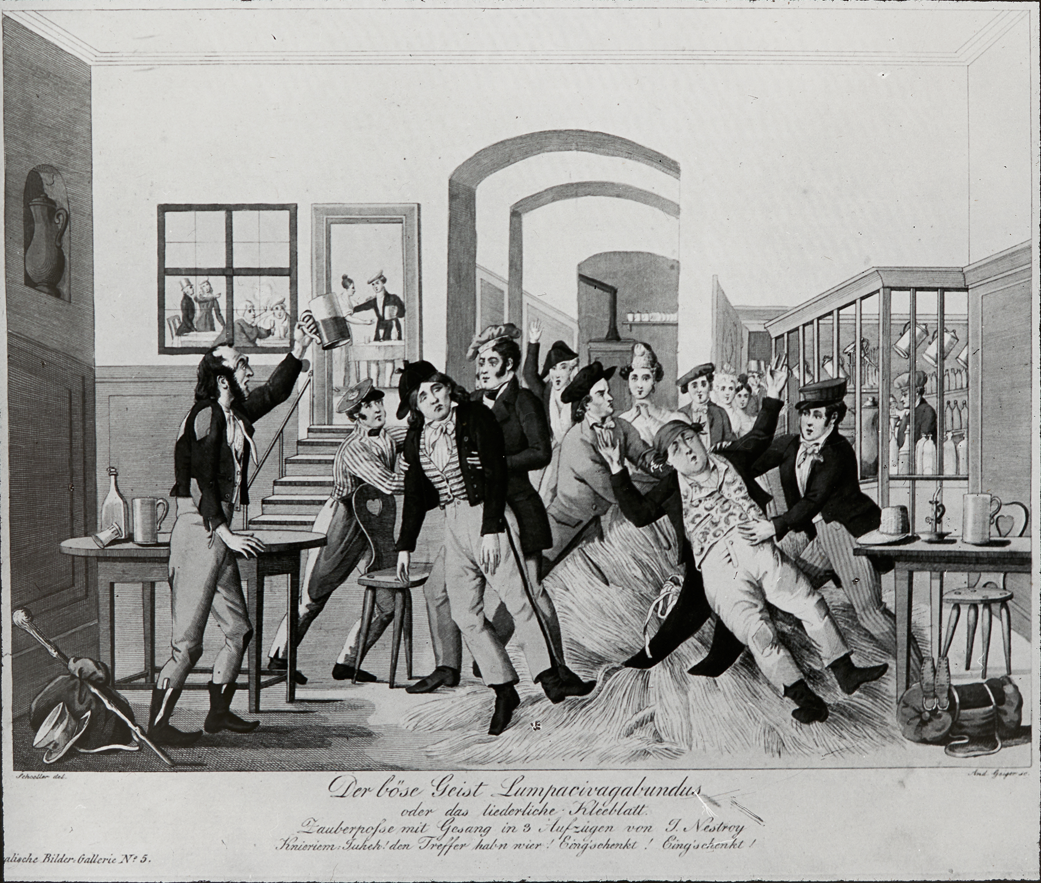 Eine Szene aus der Zauberposse mit Gesang in drei Aufzügen "Der böse Geist Lumpacivagabundus", verfasst von Johann Nestroy.