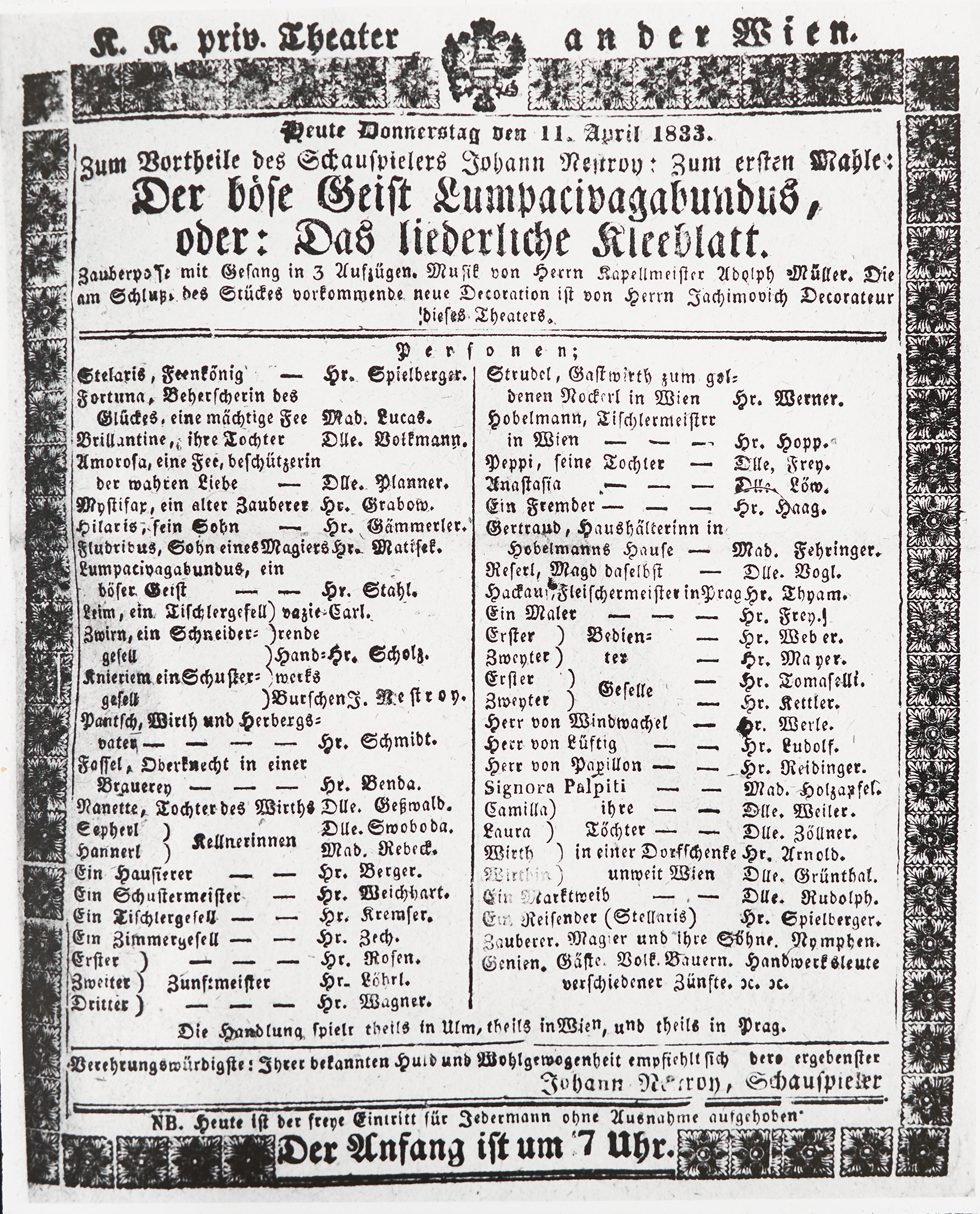 Ein Theaterblatt für die Aufführung von Nestroys Stück "Der böse Geist Lumpacivagabundus" im Theater an der Wien. Der Besuch dieses Stücks war kostenpflichtig, wie die letzte Zeile verrät: "Heute ist der freye Eintritt für Jedermann ohne Ausnahme aufgehoben".