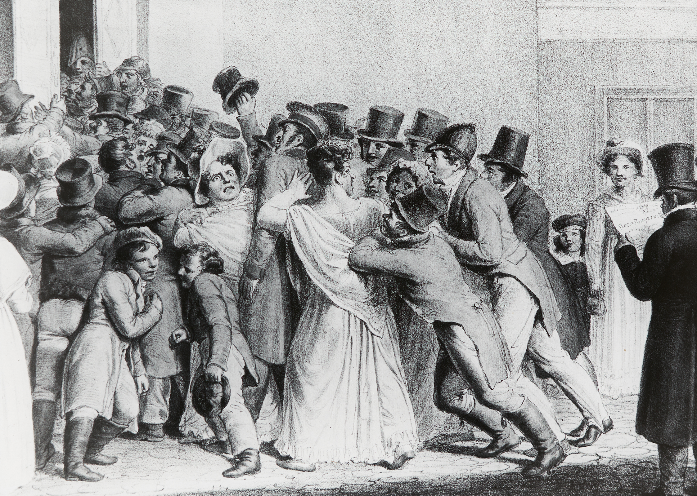 In der Zeit des Biedermeier (~1815-1848) kam es in Wien zu einem großen Anstieg der Besuchszahlen der Theater. Hier ist der große Enthusiasmus der Zuschauer dargestellt, es bricht ein Gedrängel aus.