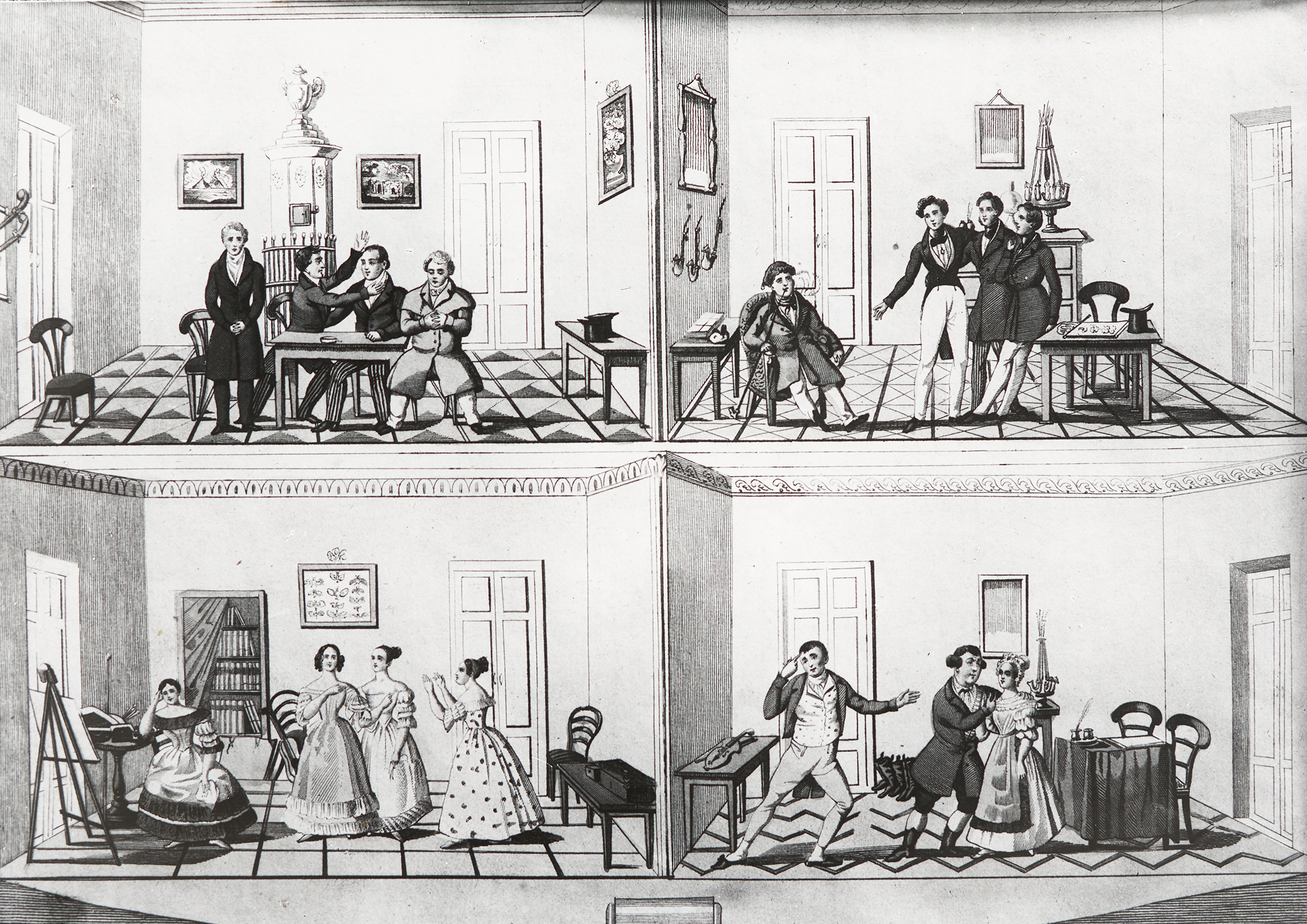 eine Posse mit Gesang in zwei Aufzügen, geschrieben von Johann Nestroy. Sie handelt von vier Wohnungen, in denen vier Familien mit jeweils unterschiedlichen Eigenschaften hausen, daher die gevierteilte Ansicht im Kupferstich von Andreas Geiger.