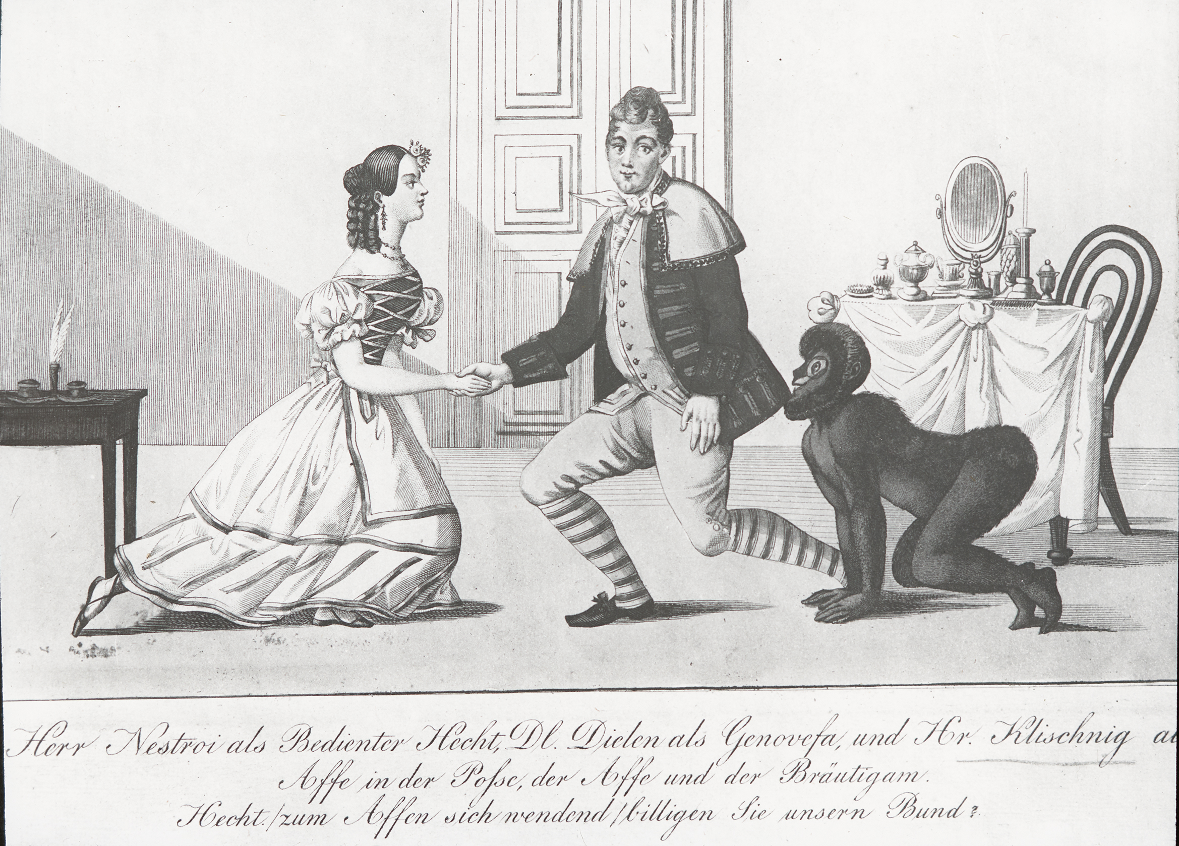 Nestroy, Dielen und Klischnig in ihren Rollen in Nestroys Posse "Der Affe und der Bräutigam".