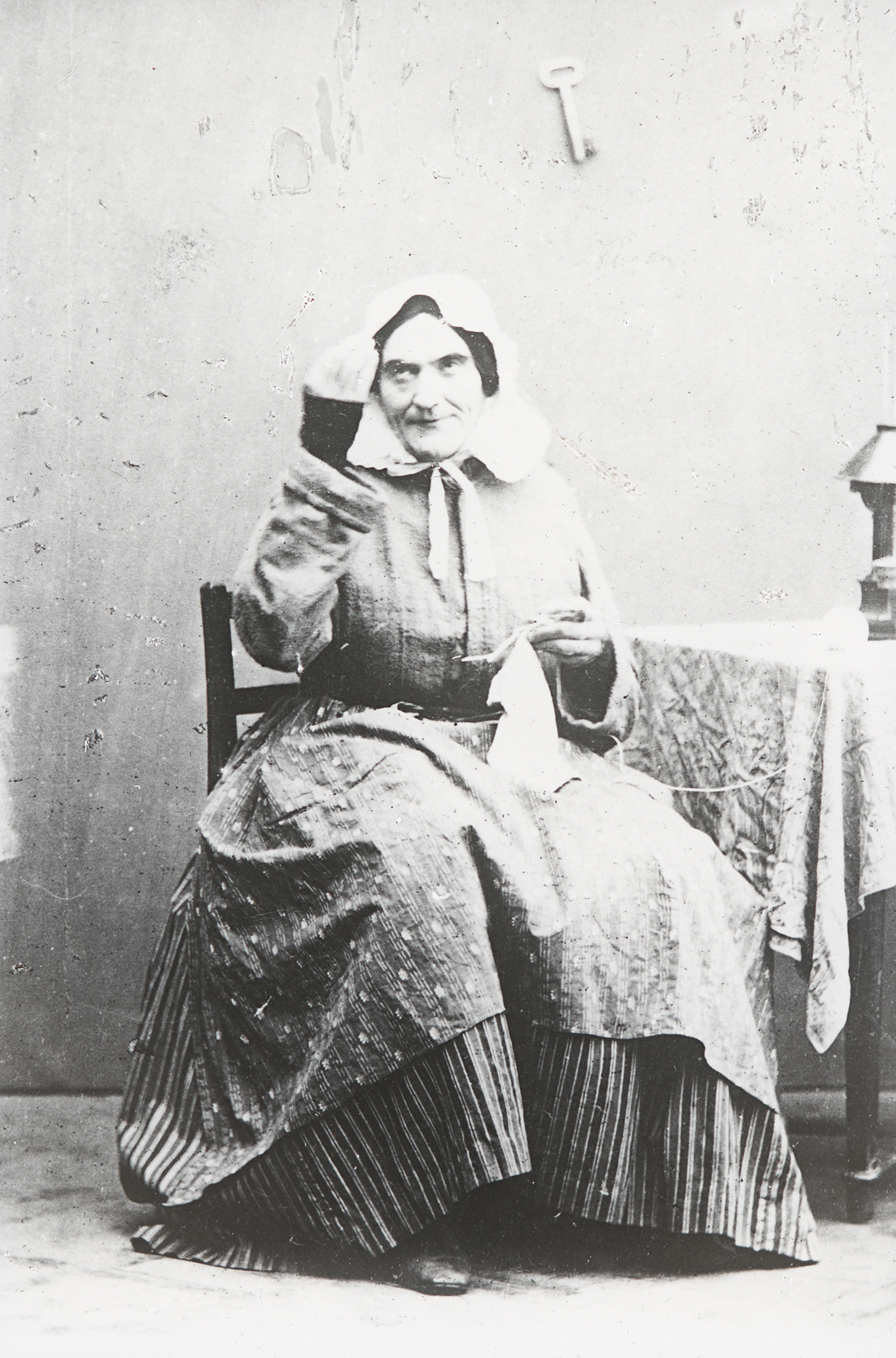 Johann Nestroy in seiner Rolle als Frau Maxl im Stück "Eine Vorlesung bei der Hausmeisterin".