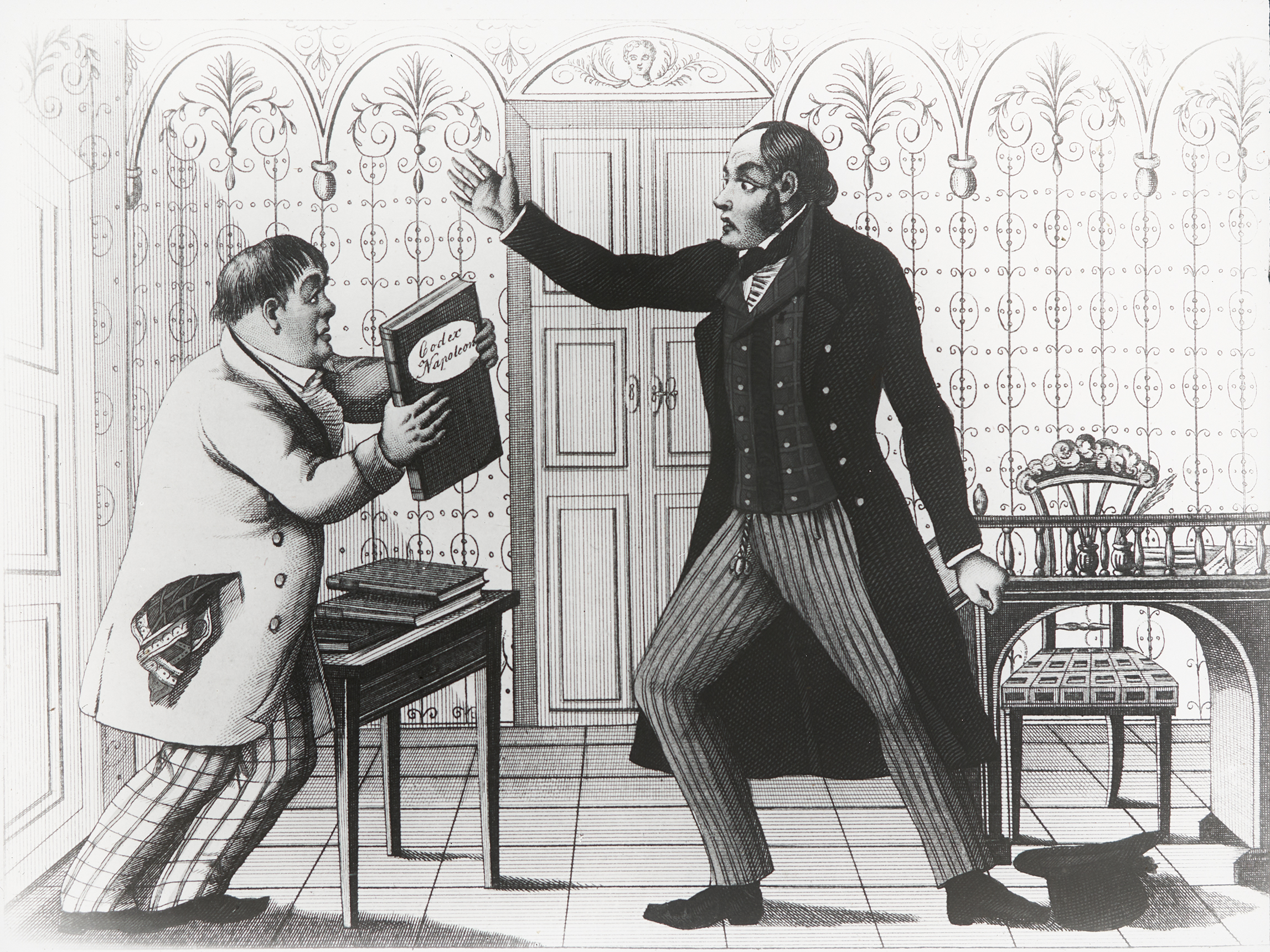 Nestroy in seiner Rolle als Zimmermann Peter Span in seiner Posse "Der Unbedeutende". Neben ihm Wenzel Scholz in seiner Rolle als Sekretär Puffmann, mit einem Codex in den Händen.