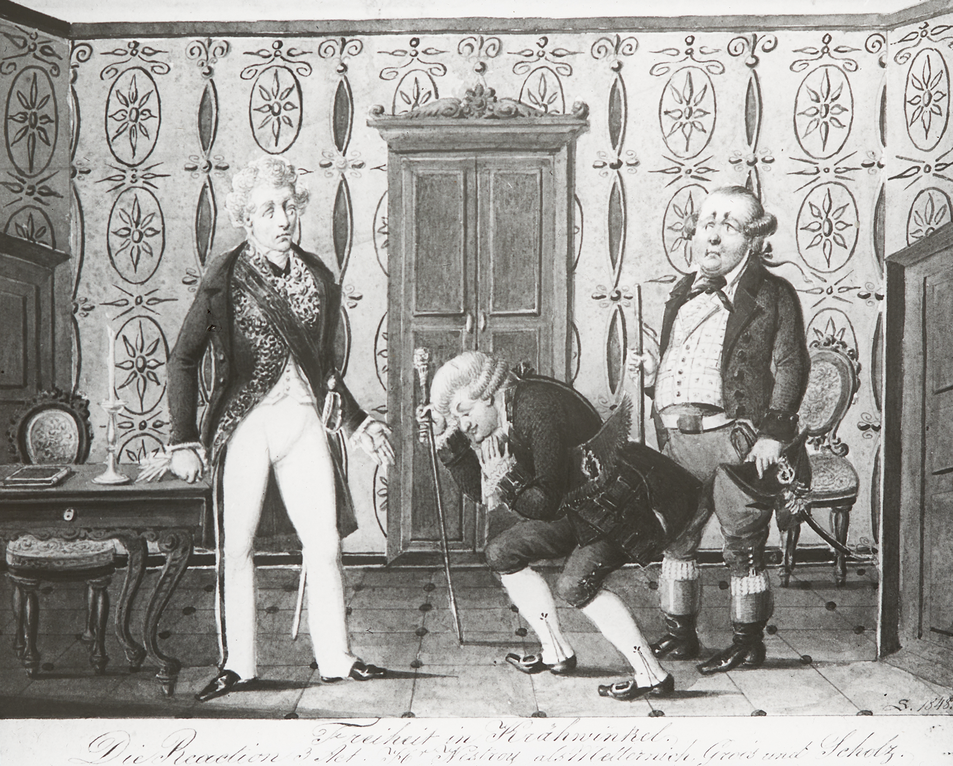 Johann Nestroy als Eberhard Ultra, verkleidet als Metternich, Wenzel Scholz als Klaus und Louis Groh als Bürgermeister in Freiheit in Krähwinkel.