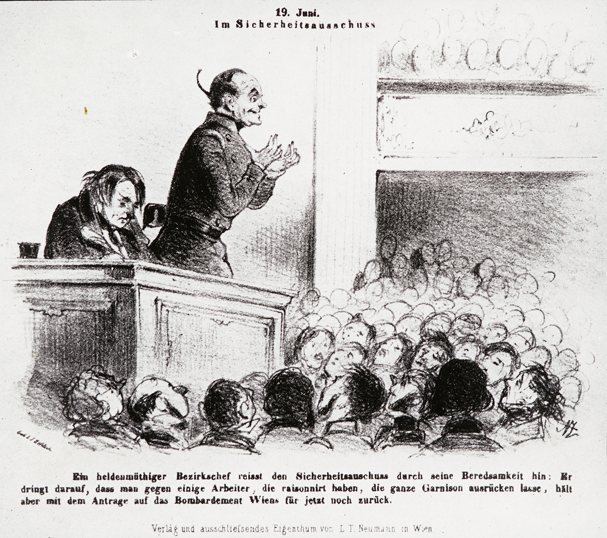 "Ein heldenmüthiger Bezirkschef reisst den Sicherheitsausschuss durch seine Beredsamkeit hin: Er dringt darauf, dass man gegen einige Arbeiter, die raisonnirt haben, die ganze Garnison ausrücken lasse, hält aber mit dem Antrage auf das Bordament Wiens für jetzt noch zurück."