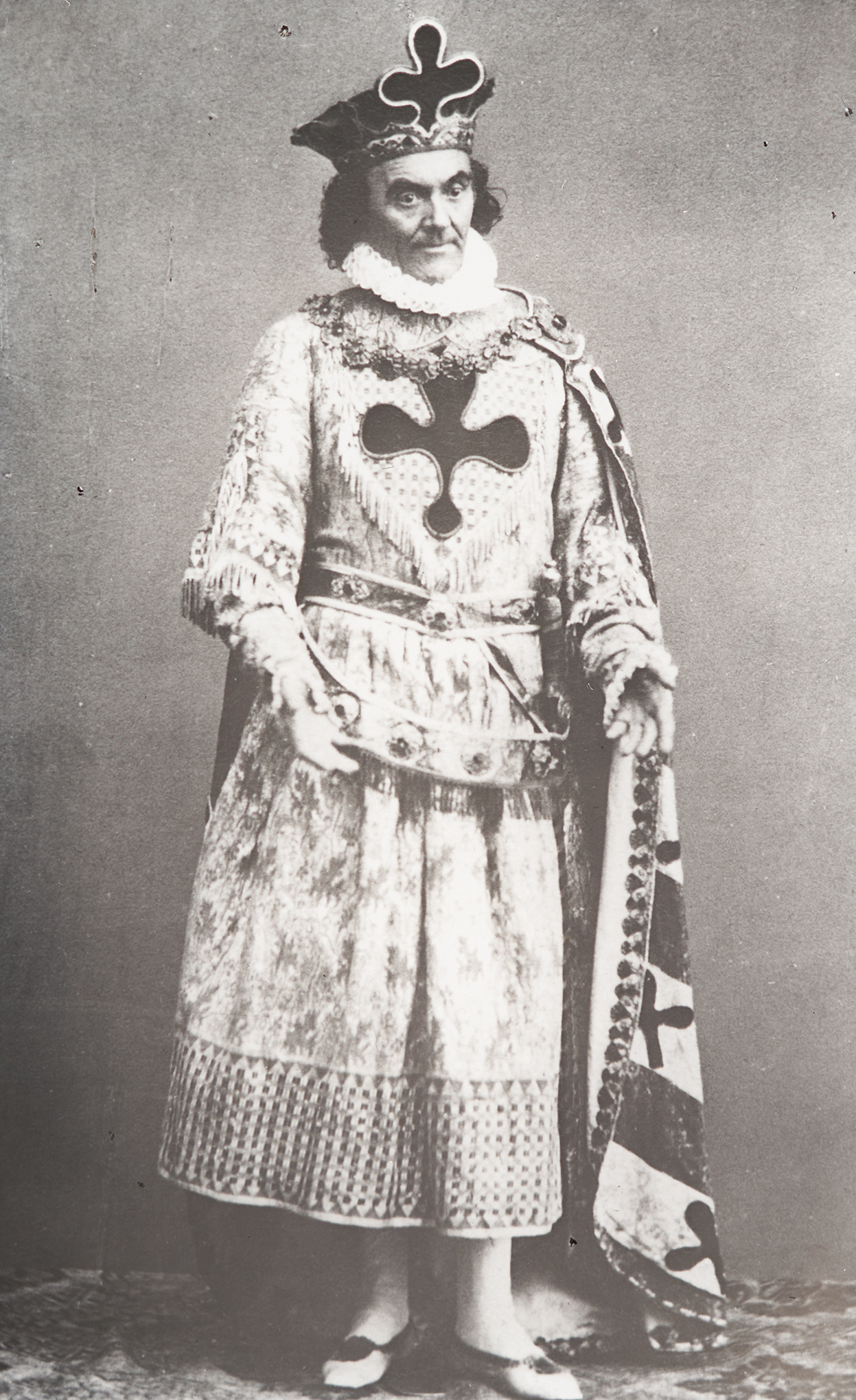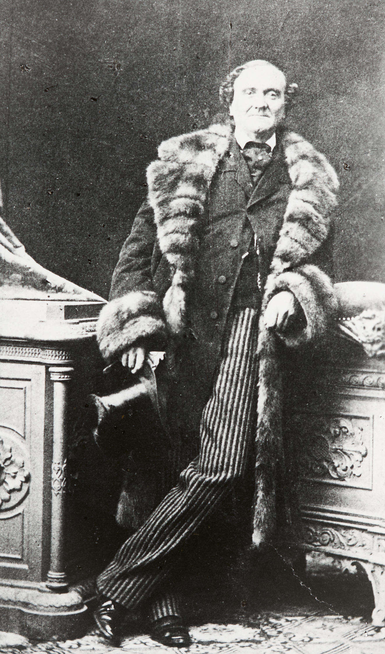 fotografiert im Pelzmantel in seiner Rolle als Bertram. Er lehnt an einem nebenstehenden Möbelstück. Er lebte von 1801 bis 1862.