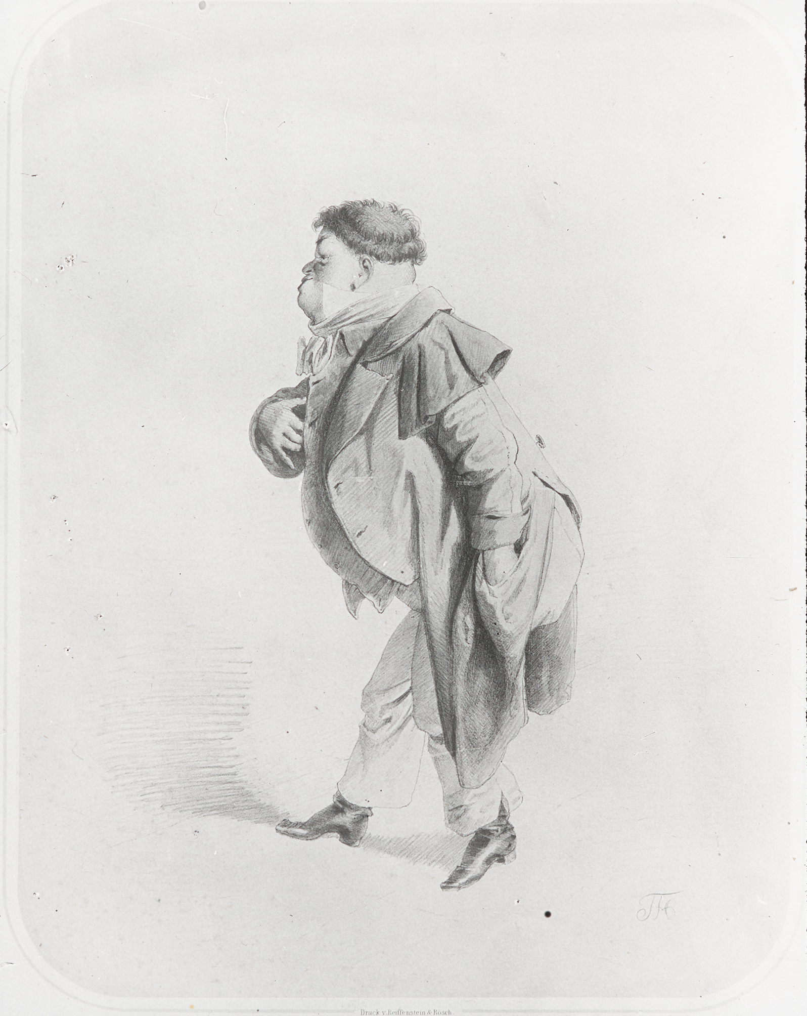 Johann Nestroy im Mantel mit Jackett, eine Lithographie von Josef Kriehuber.