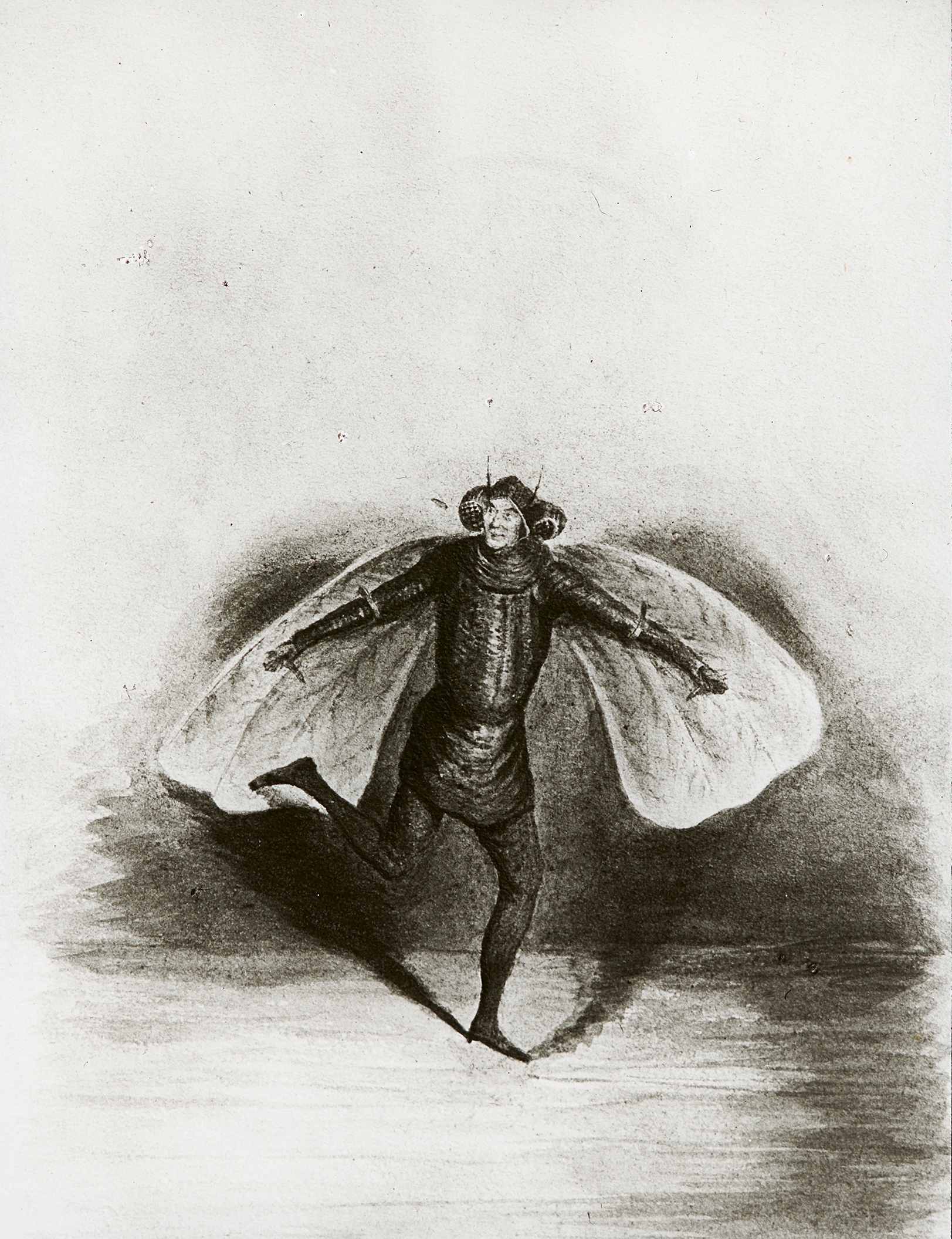 Johann Nestroy, verkleidet mit Flügeln, in Jacques Offenbachs Oper "Orpheus in der Unterwelt".