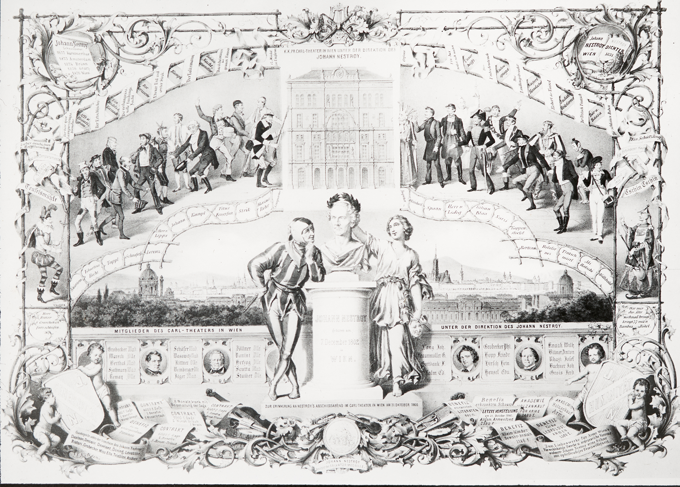 Am 31. Oktober 1860 wurde Johann Nestroy feierlich vom Carl-Theater verabschiedet. Im Zuge dessen wurde dieses Bild, das seinen Werdegang darstellen soll, angefertigt.