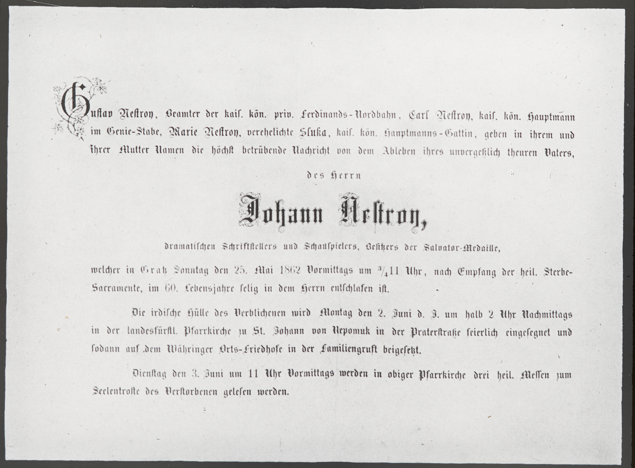 Todesanzeige von Johann Nestroy