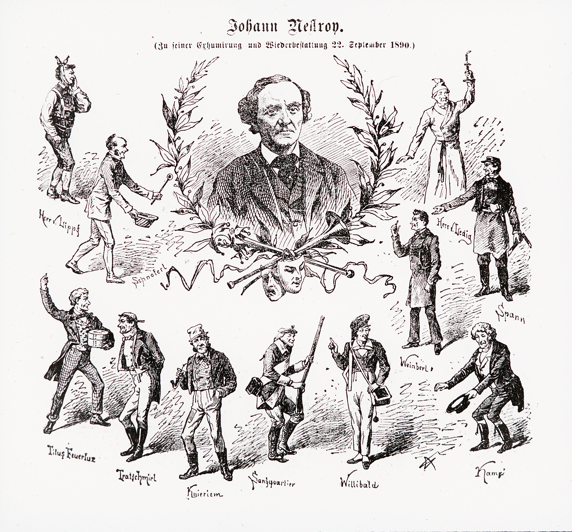 Zur Exhumierung und Wiederbestattung von Johann Nestroy wurde dieses Bild erstellt. Elf seiner bekanntesten Rollen sind hier dargestellt. Er wurde am 22. September 1890 vom Währinger Ortsfriedhof in den Wiener Zentralfriedhof umgebettet und erhielt dort ein Ehrengrab.
