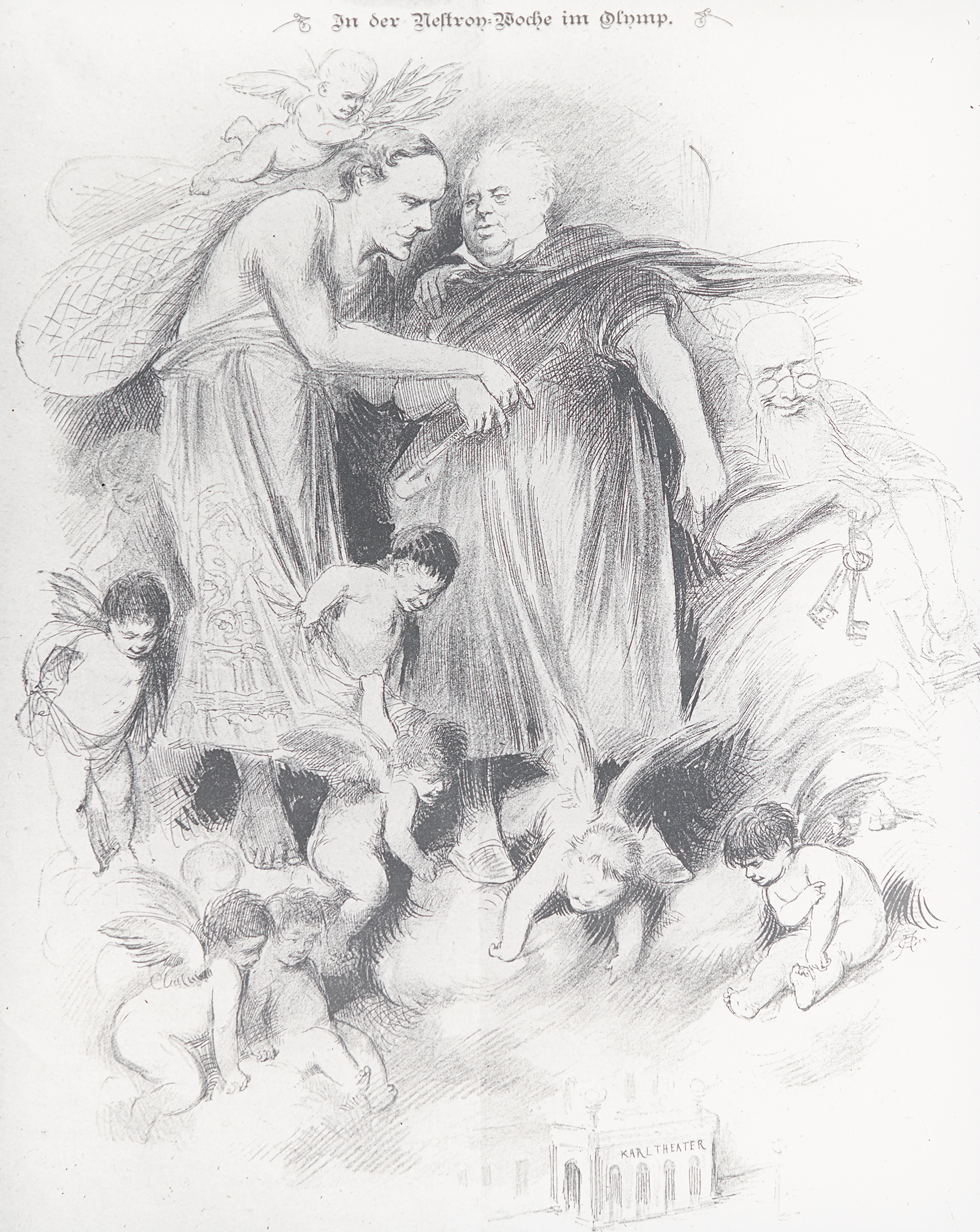 Die Zeichnung zeigt Nestroy mit Flügeln, vermutlich eine Hommage an seine Rolle in Jacques Offenbachs "Orpheus in der Unterwelt". Gemeinsam mit einigen Engelsfiguren blickt er hinab auf das Karltheater, das Theater in der Leopoldstadt.