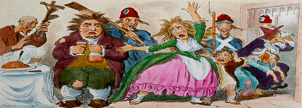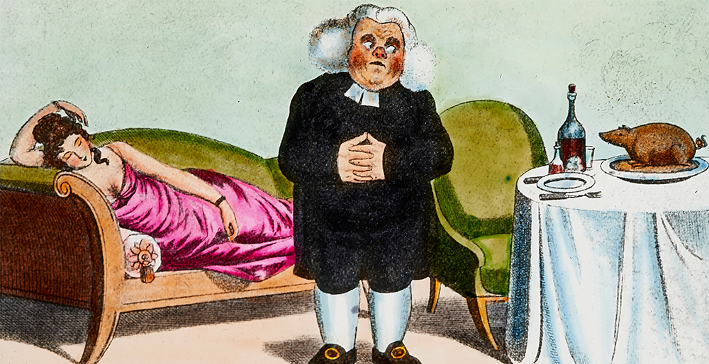 Ironische und gesellschaftskritische Karikaturen von verschiedenen Künstler:innen (Pieter Brueghel, William Hogarth, James Gillray, Cari b. Martinet,…) sowie Gemälde von Künstlern wie Leonhard Strauch.