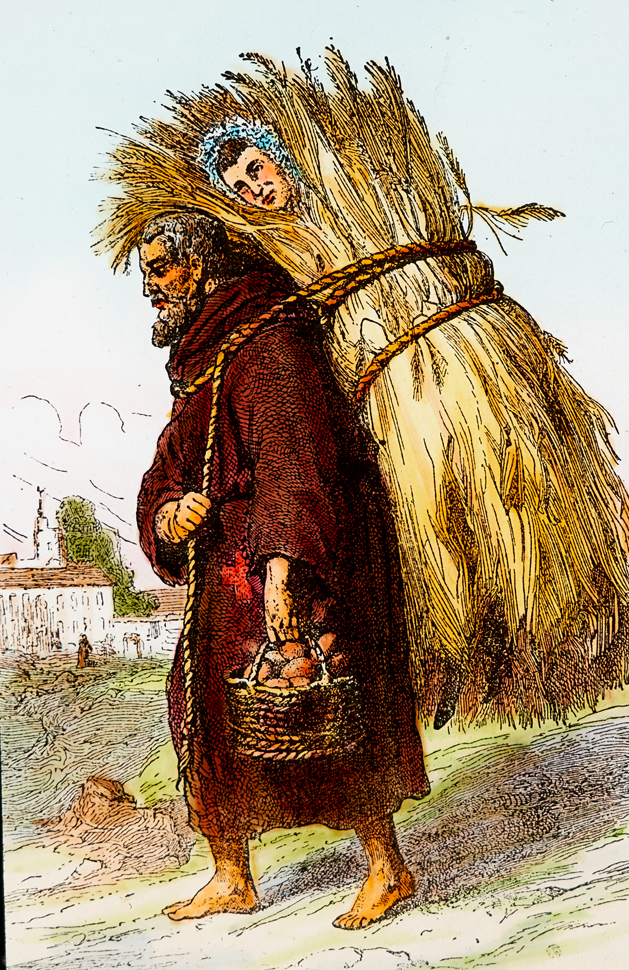 Ein Mann, der mit Strohbündel am Rücken und Korb in der Hand umhergeht. Im Strohbündel versteckt sich eine weitere Person.