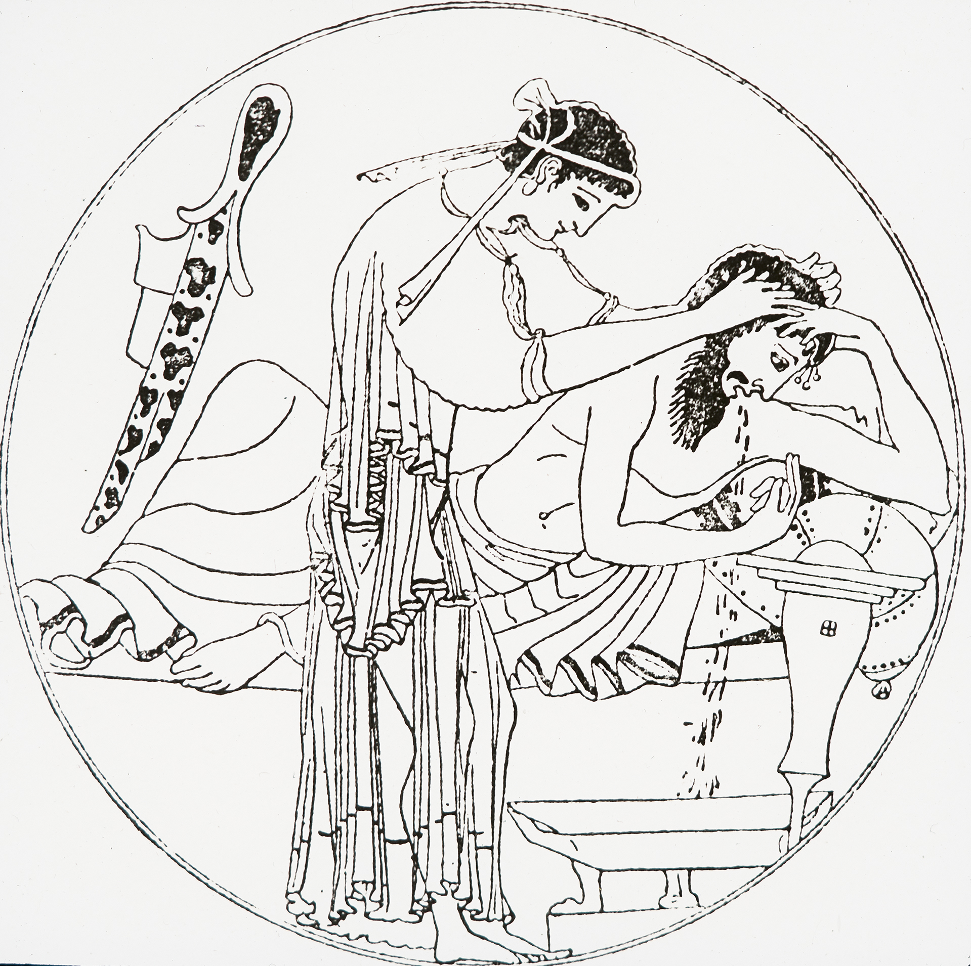 Zwei Männer, die keine Hemden tragen. Einer von ihnen trinkt aus einer Schüssel, während der andere sich die Hände trocknet.