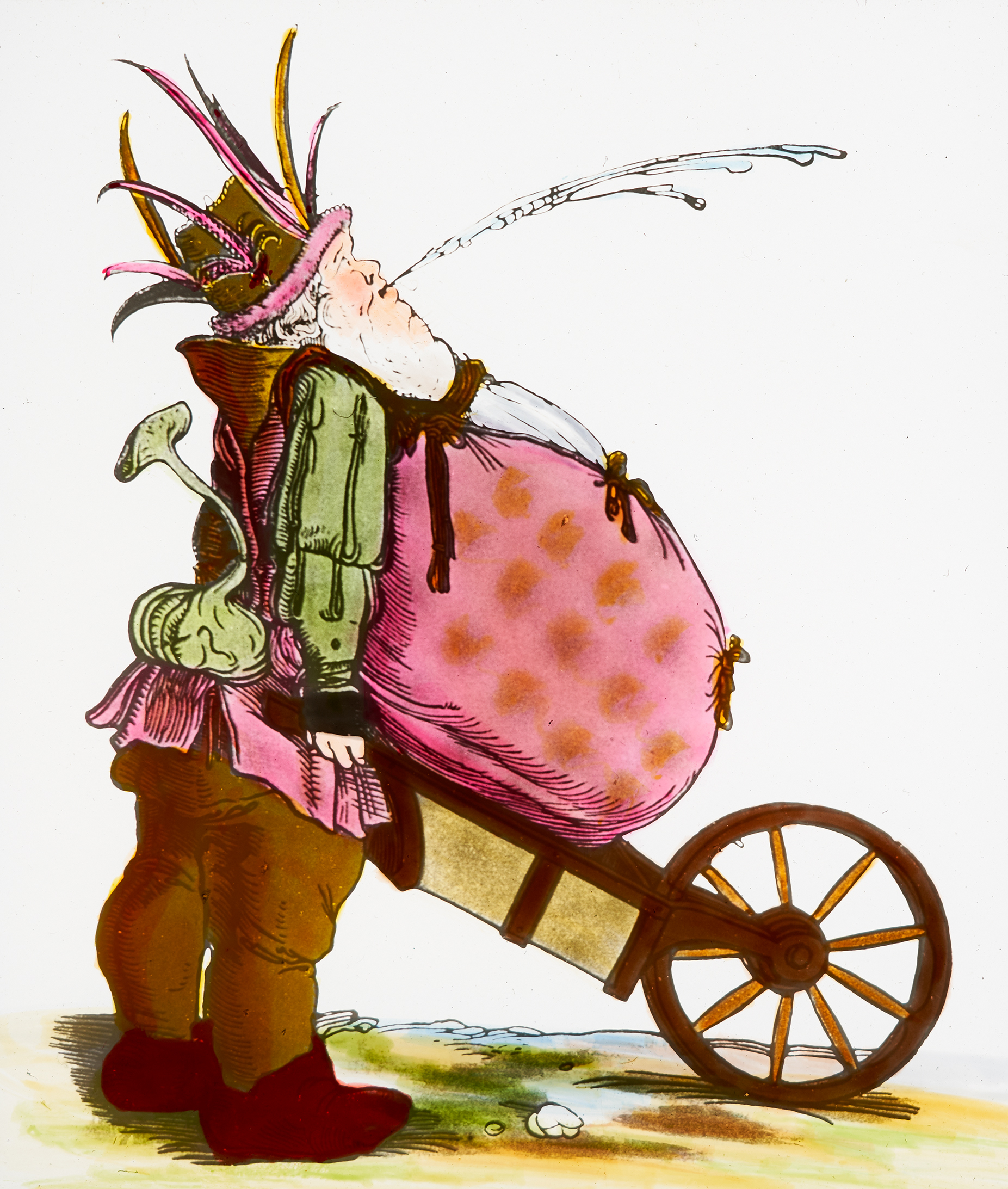 Ein Mann, der Wasser spuckt, mit einer Schubkarre auf der er seinen Bauch ablegt.