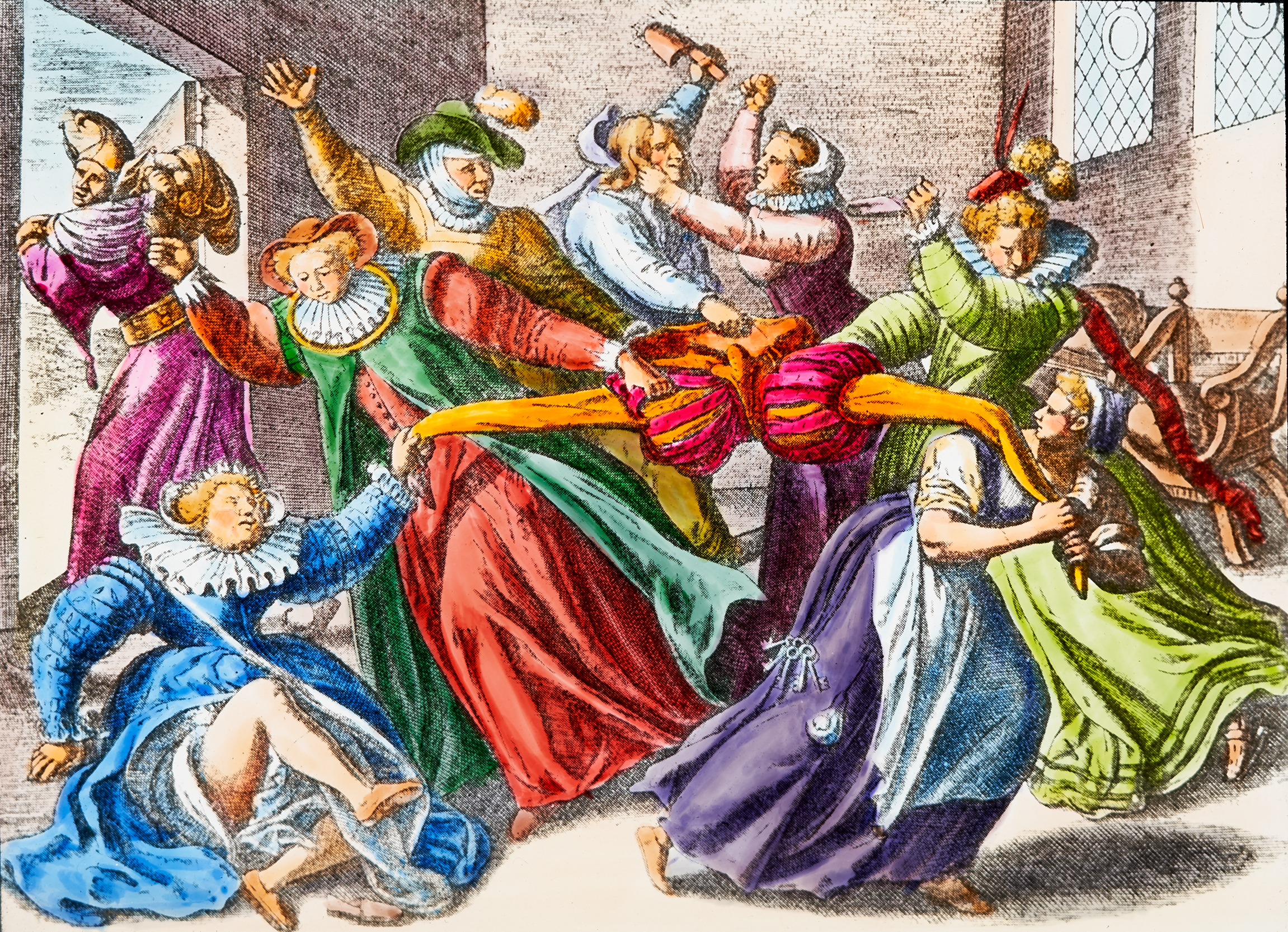 Zeichnung der Streitszene einer Gruppe an Menschen.