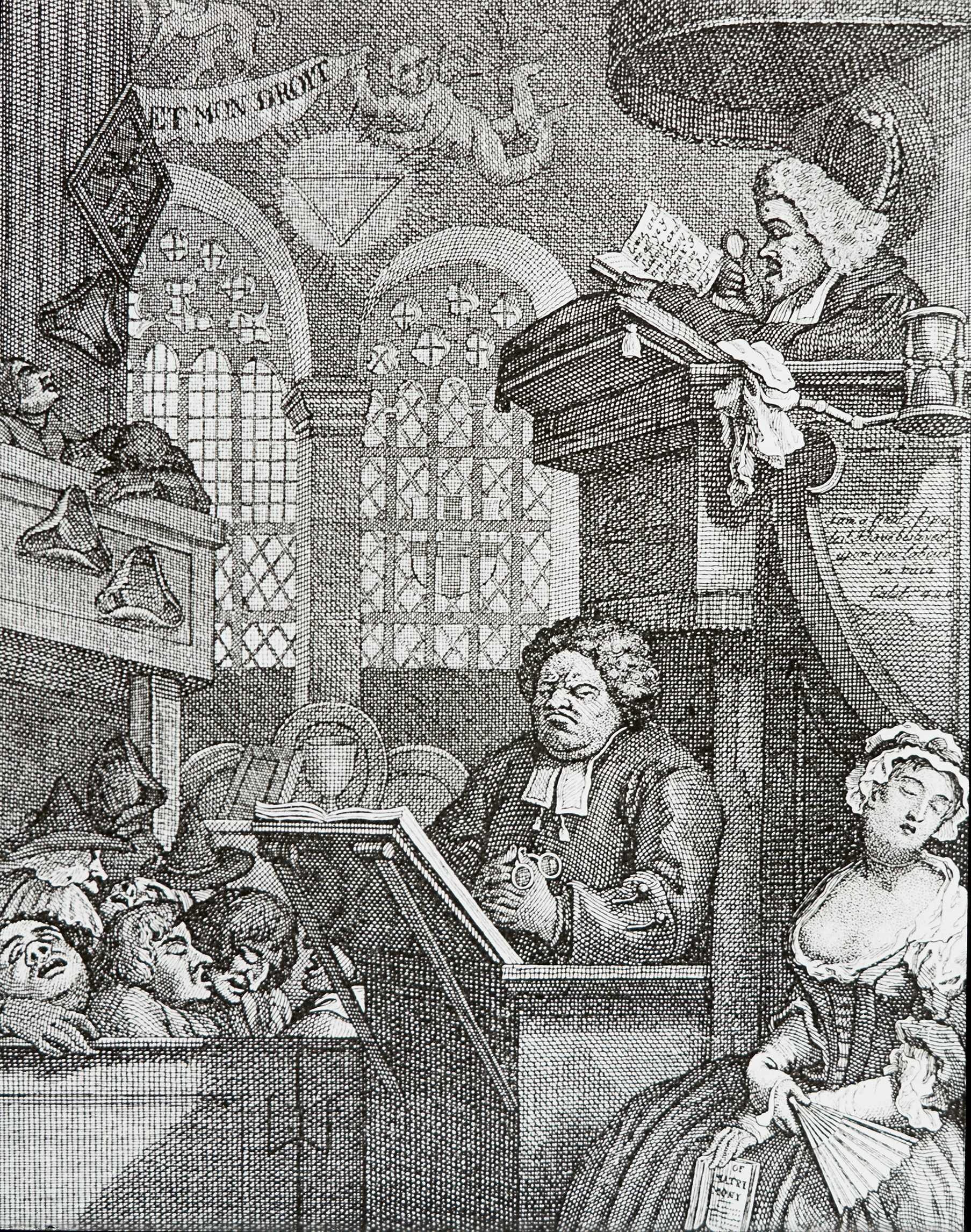 Szenerie in einer Kirche. Alle Menschen, abgesehen vom Prediger, schlafen.