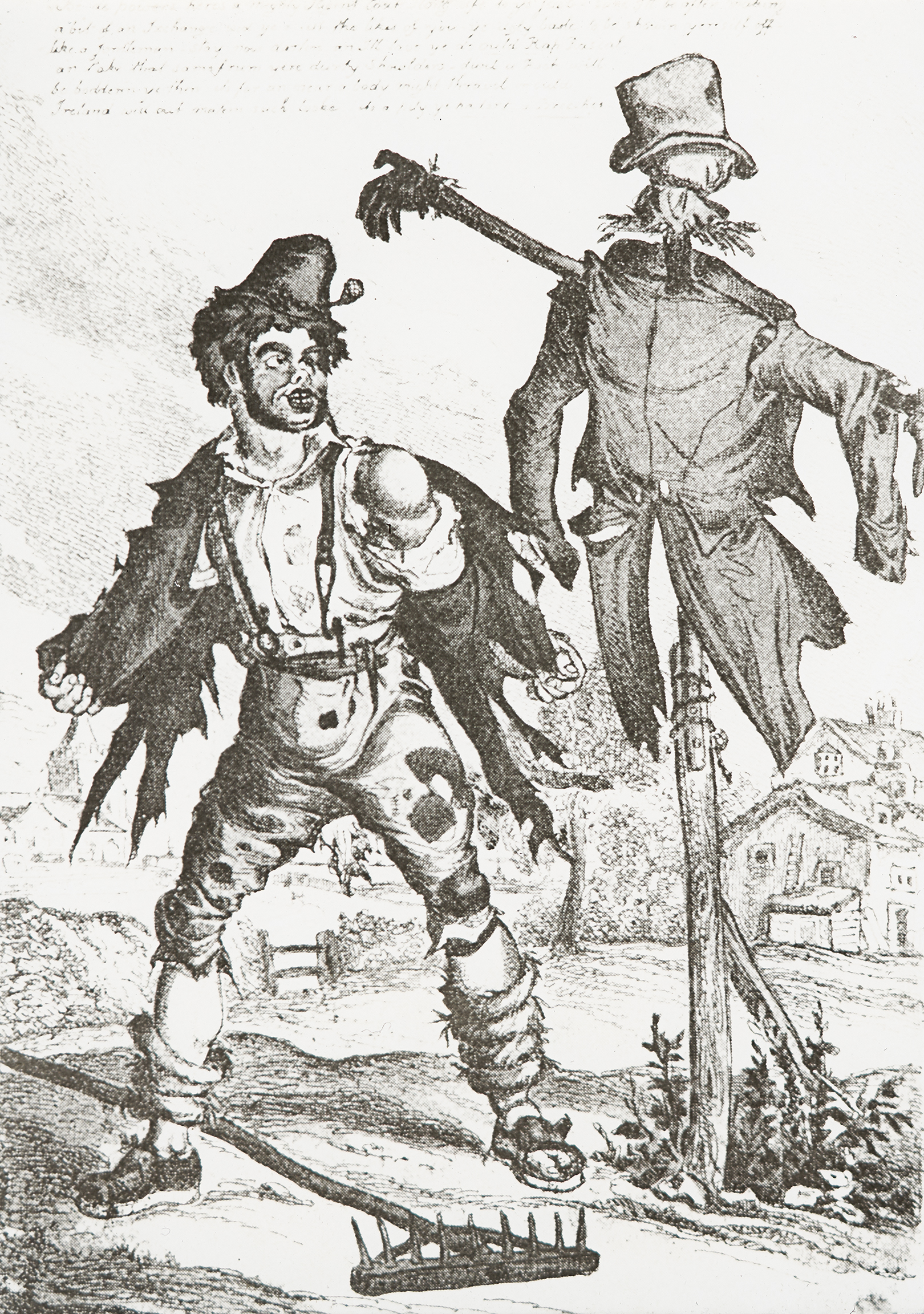 Karikatur einer Vogelscheuche, neben der ein Mann steht.