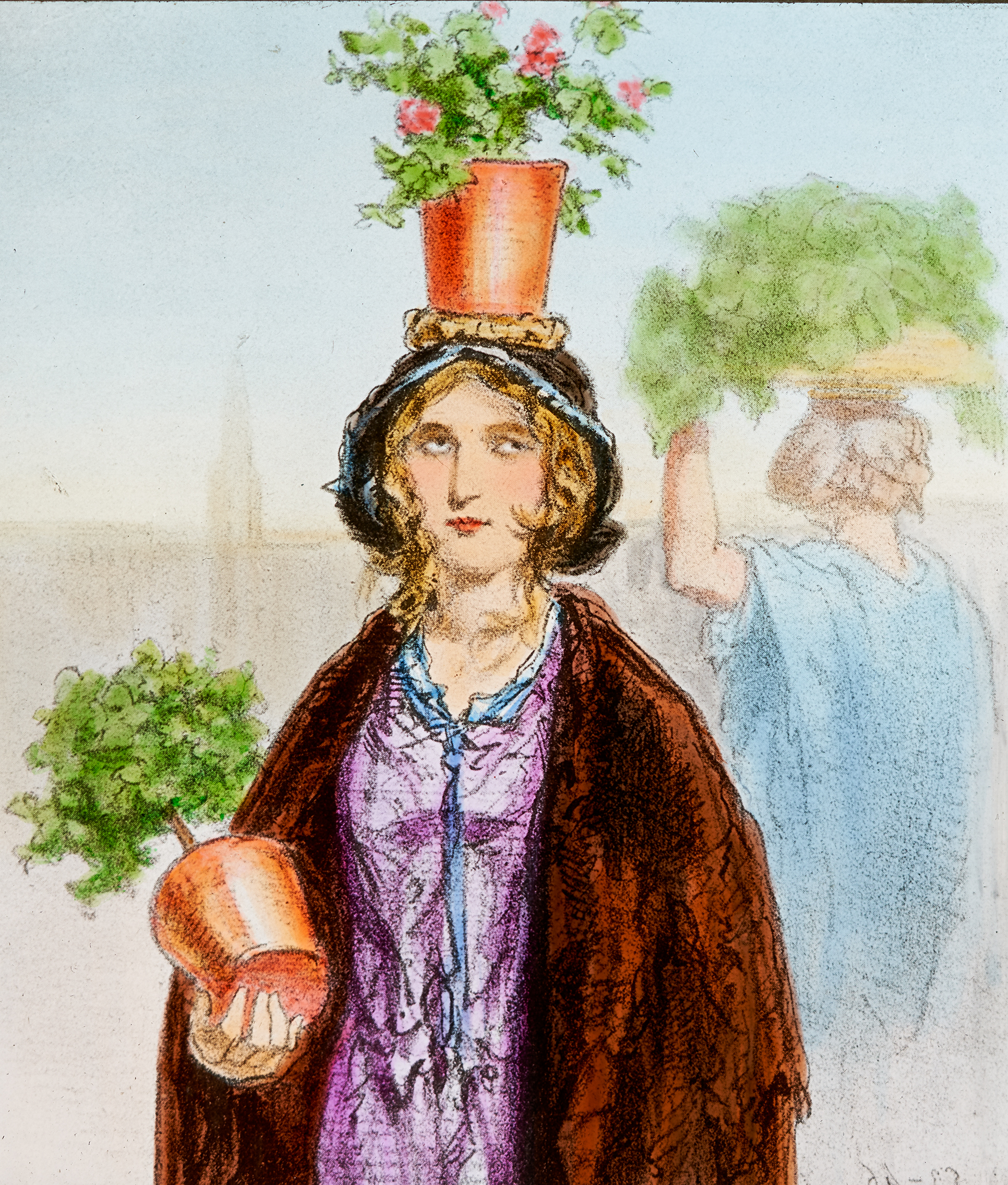 Eine Frau, die einen Blumentopf in der Hand trägt und einen weiteren am Kopf balanciert.