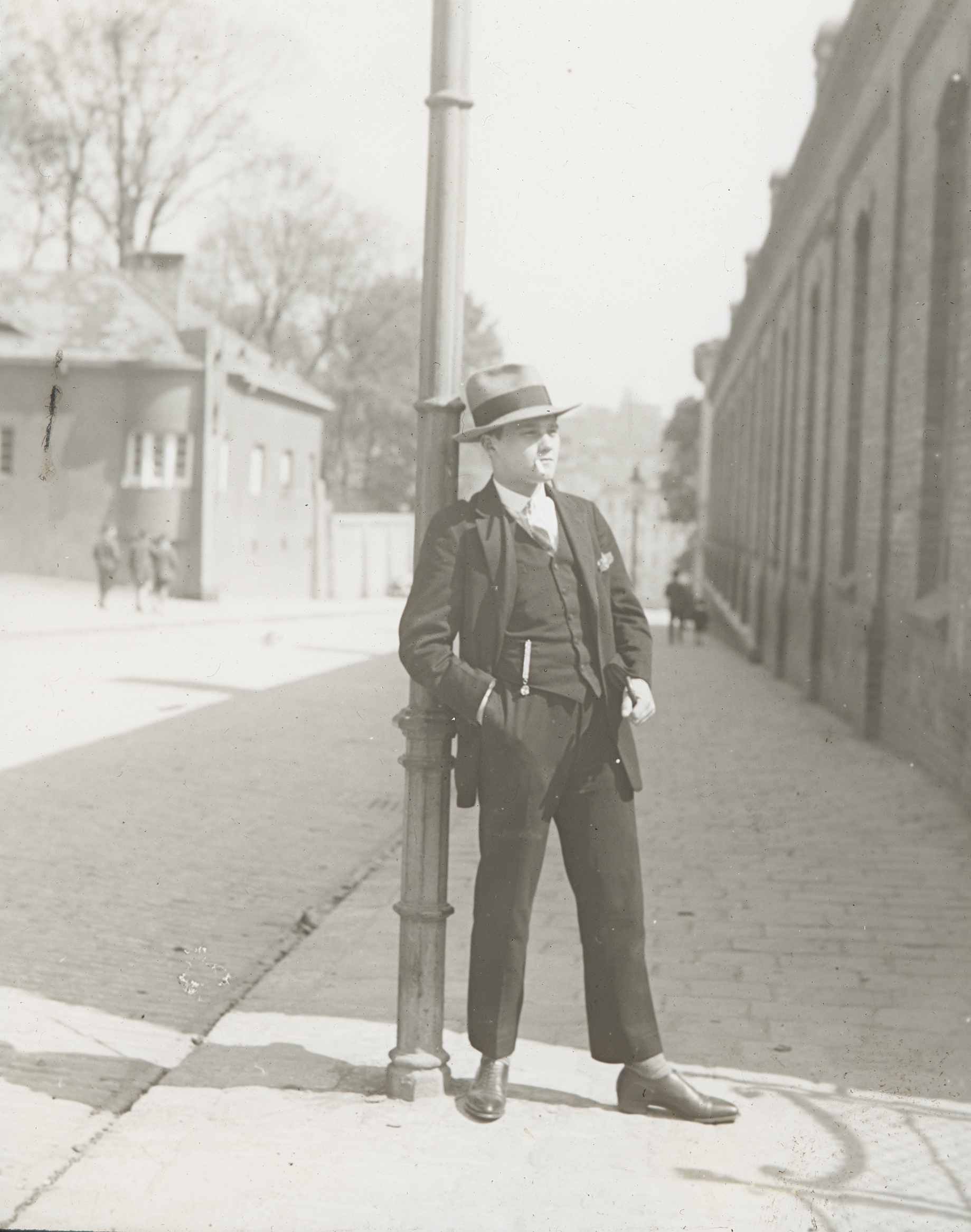 Ein Mann in Anzug mit Hut, der eine Zigarette im Mund hat. Er lehnt an einem Straßenpfeiler.