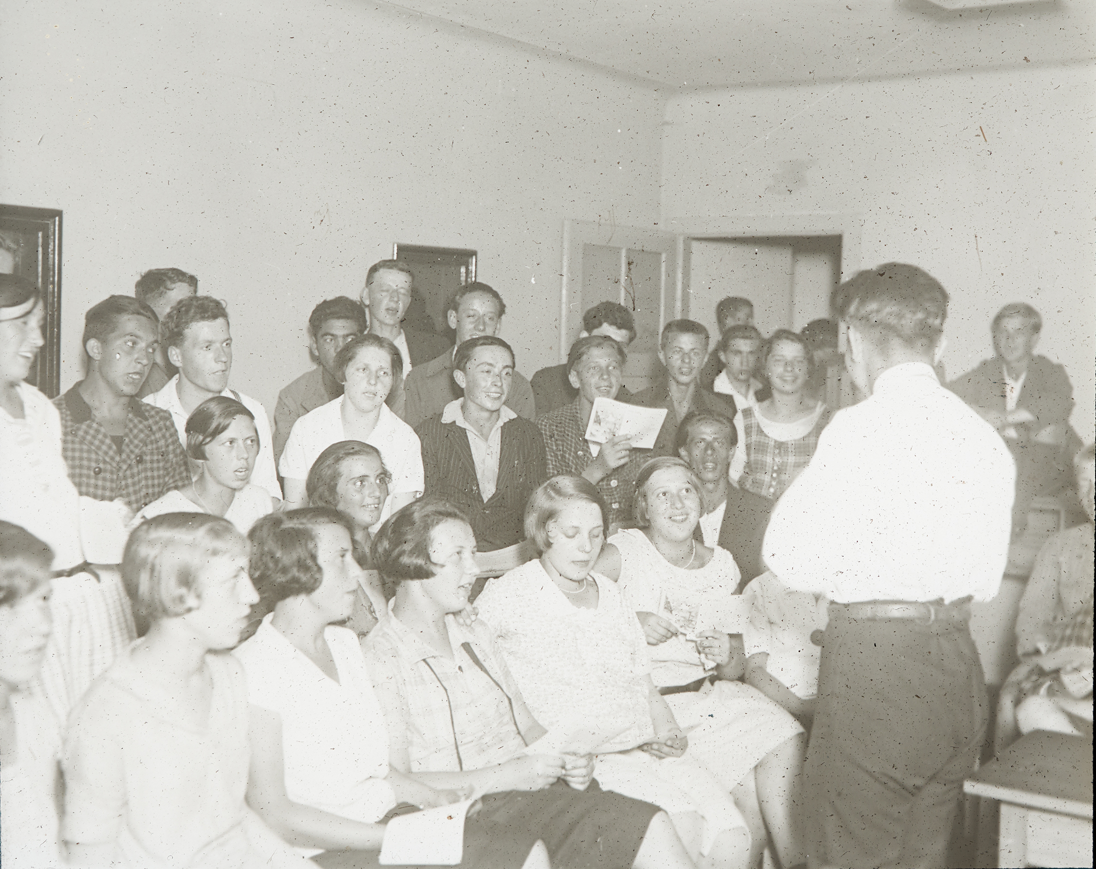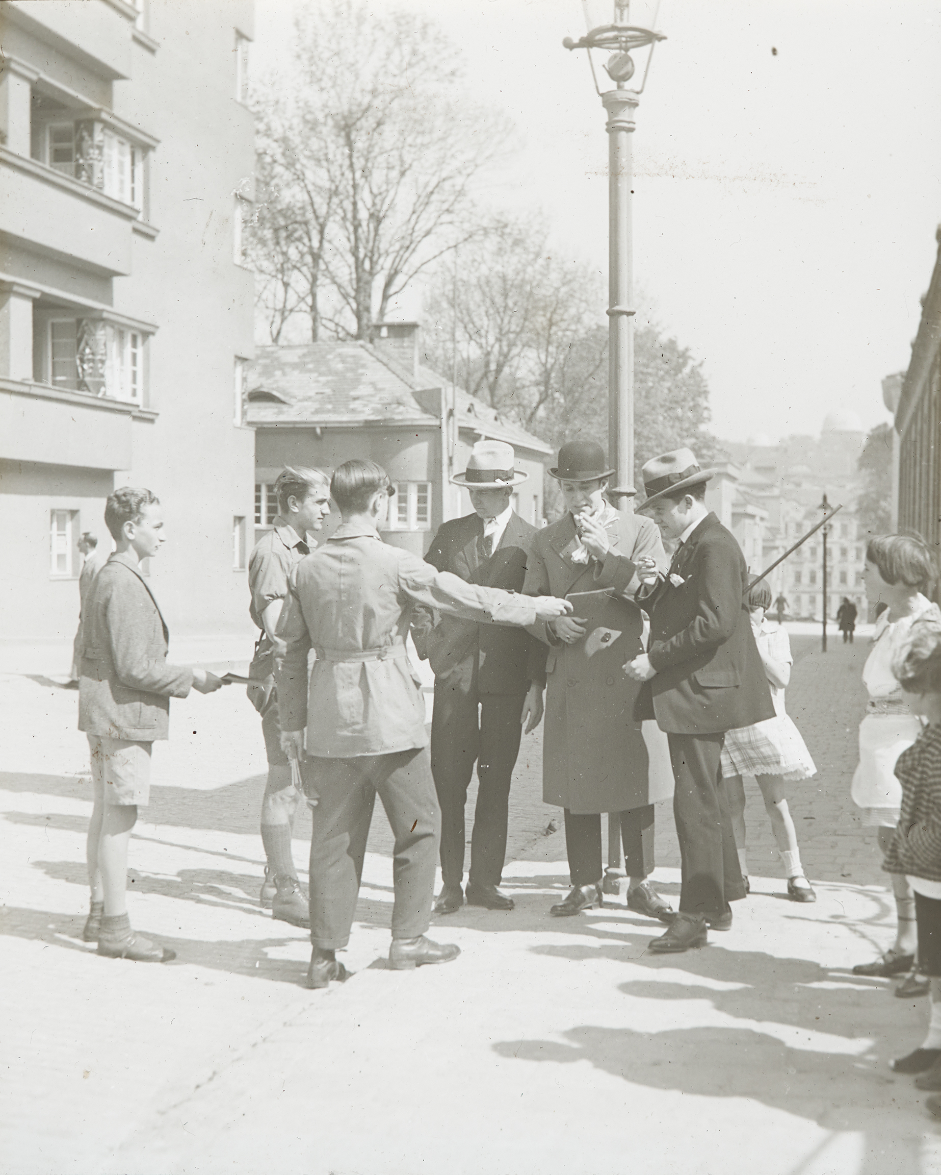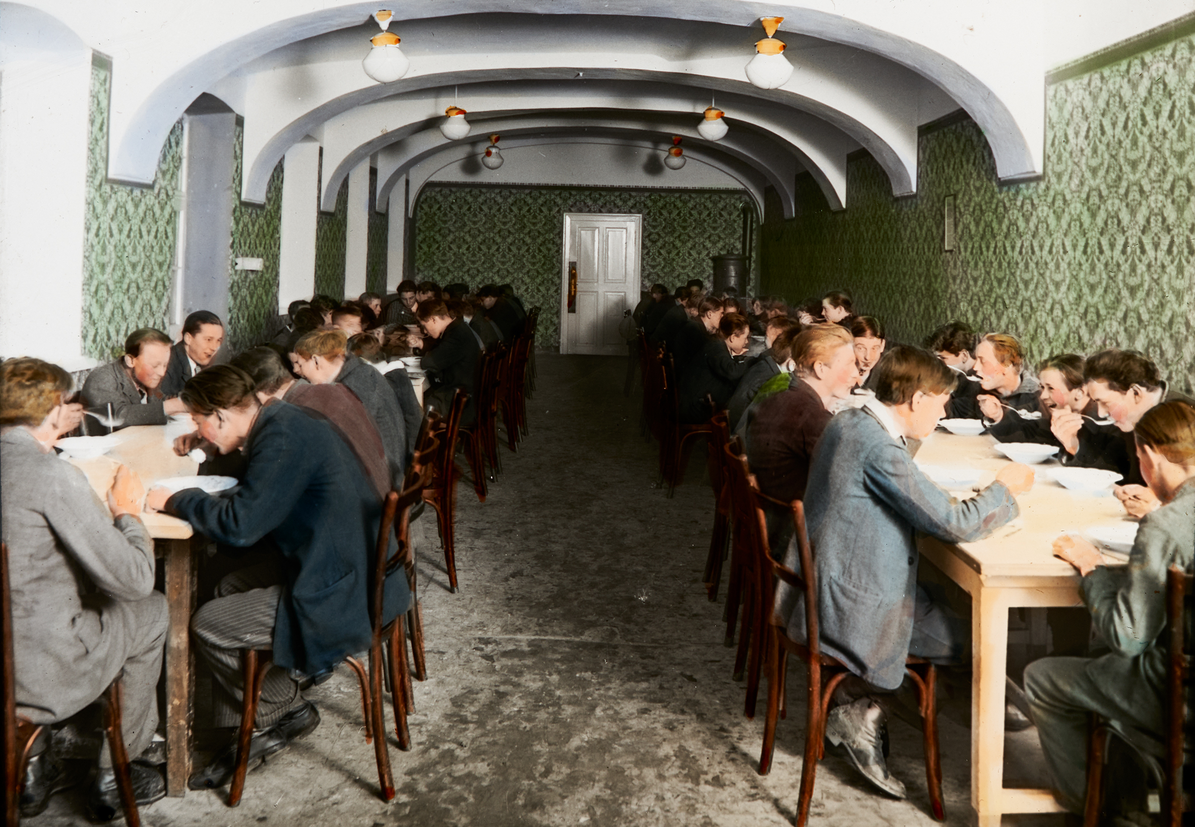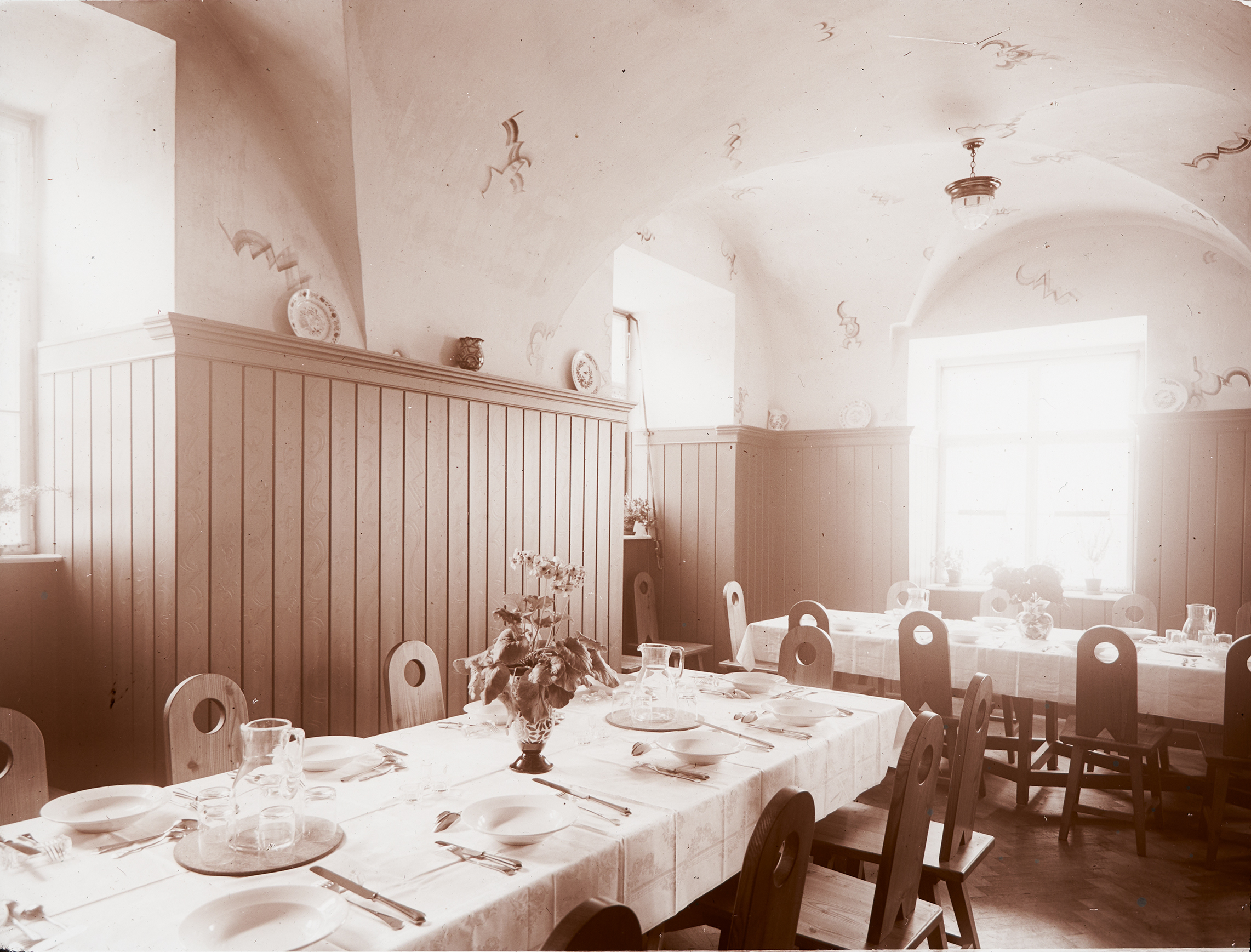 Aufschrift des Dias: "Photo Mansky, VI., Linke Wienzeile 58 Speisesaal"