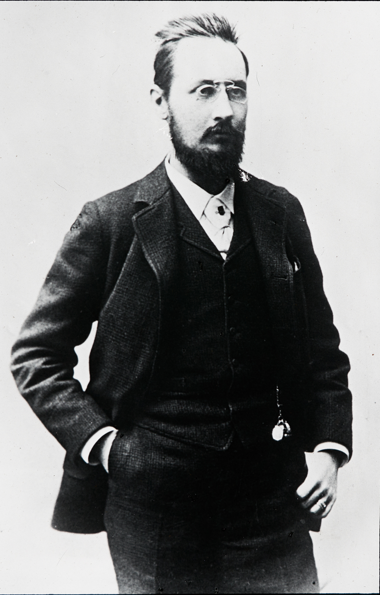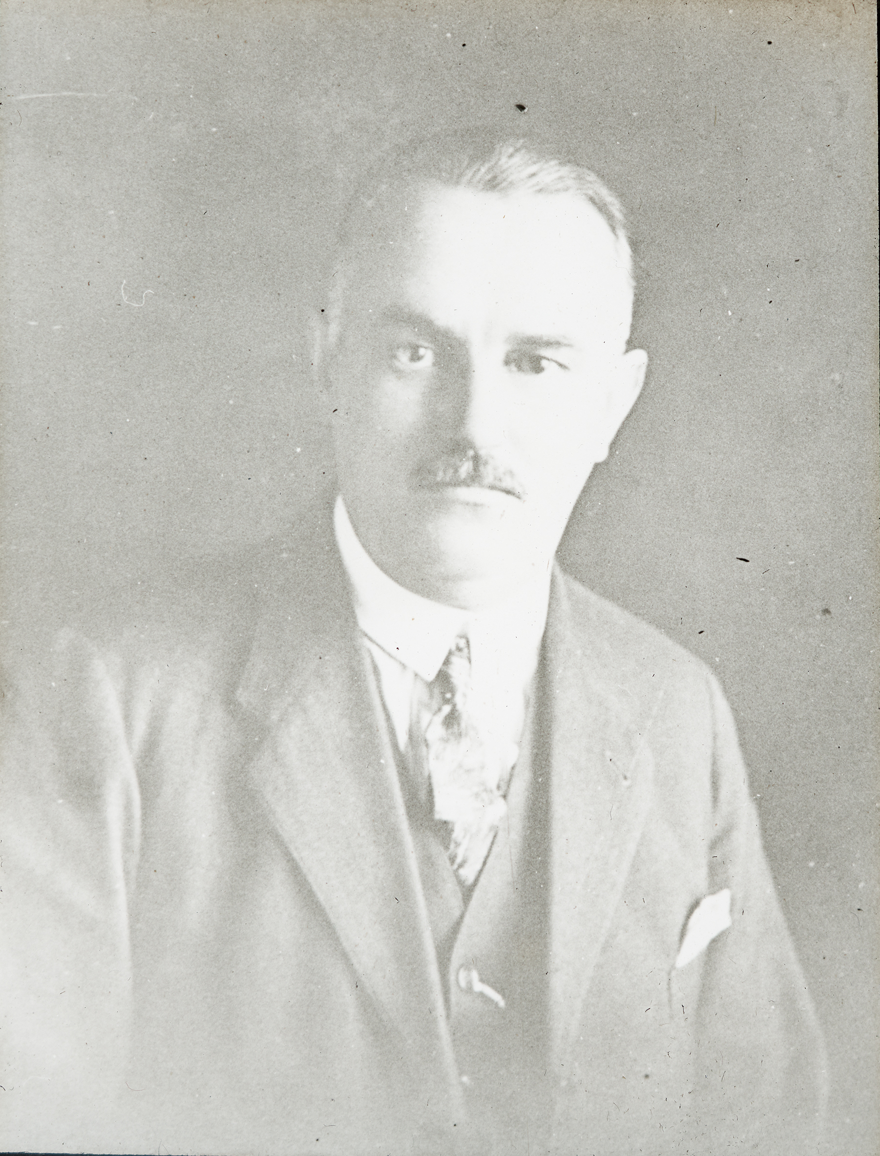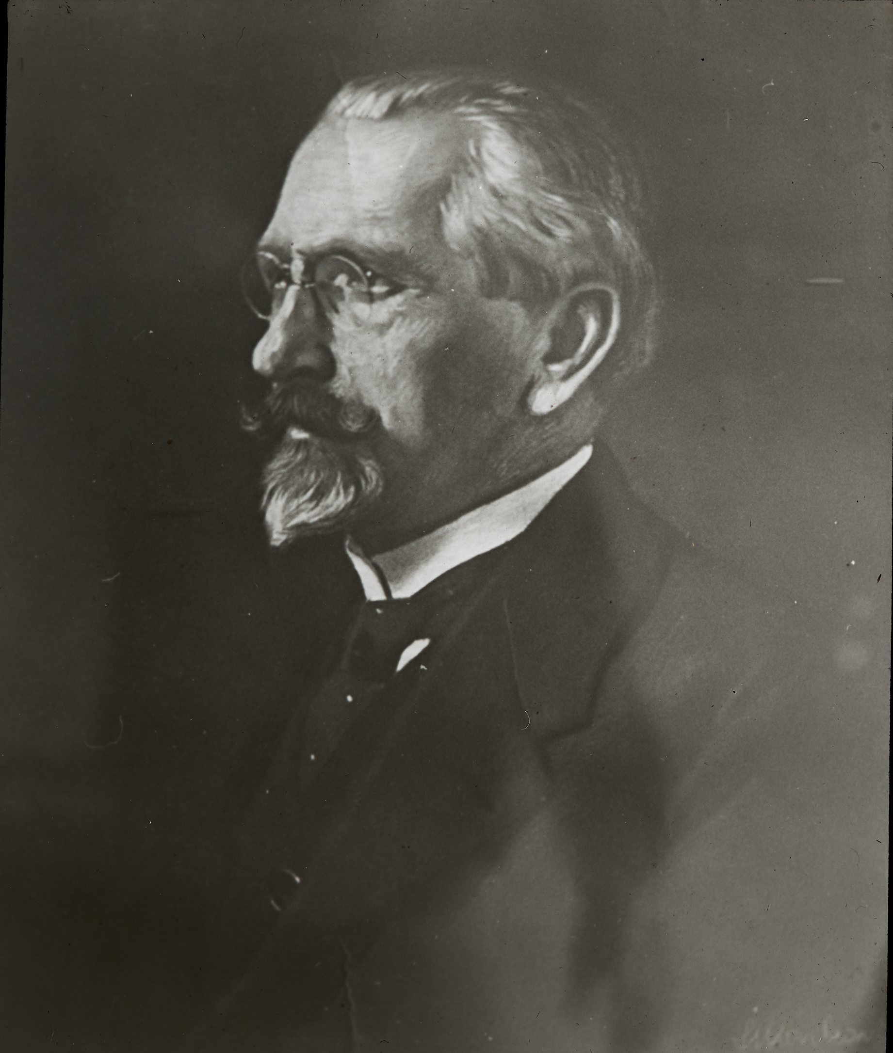 Das Portrait eines Mannes, der einen Anzug mit Weste und eine Brille trägt.