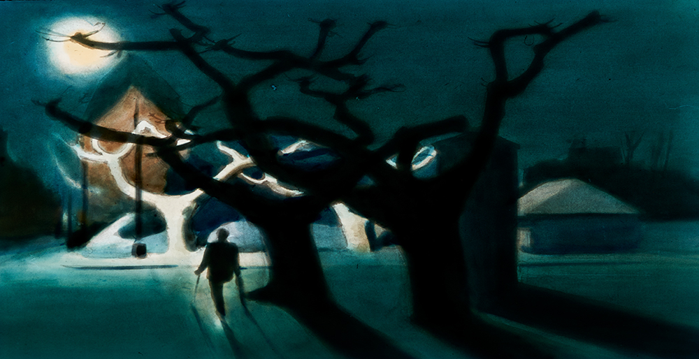 Kolorierte und schwarz-weiße Aquarelle, die oftmals Wohnsituationen darstellen. Elemente des Wohnens (Veranda, Häuser, Garten) gespickt mit Elementen der Natur (Bäume, Sträucher, Mondschein, …)