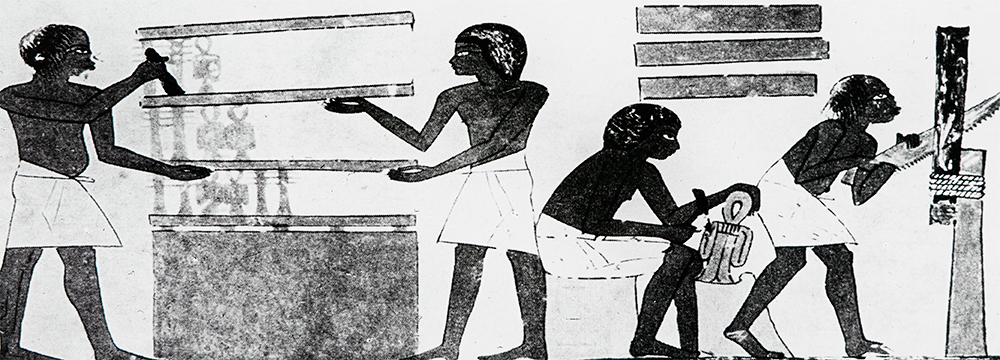Verschiedene Berufsbilder (Industrie, Weberei, Holzarbeit, Mühle, …) und Versionen der Fortbewegungsmittel im Laufe der Zeit (Streitwagen, Kutsche, Auto, Flugzeug,…).