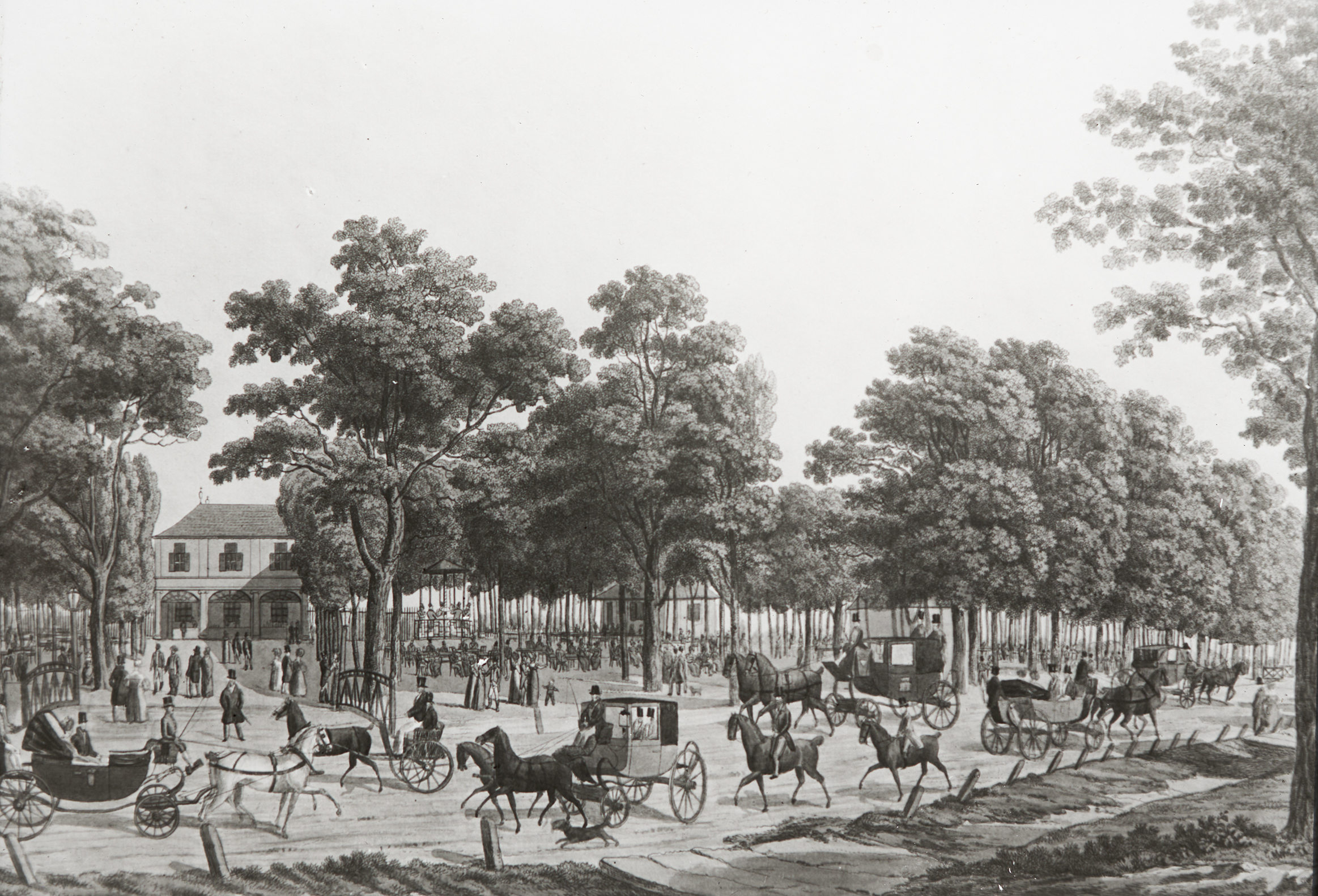 An der Hauptallee im Prater befanden sich damals sehr gut besuchte Kaffeehäuser. Hier ist auch der Kutschenverkehr abgebildet, der um die damalige Zeit im Prater herrschte.