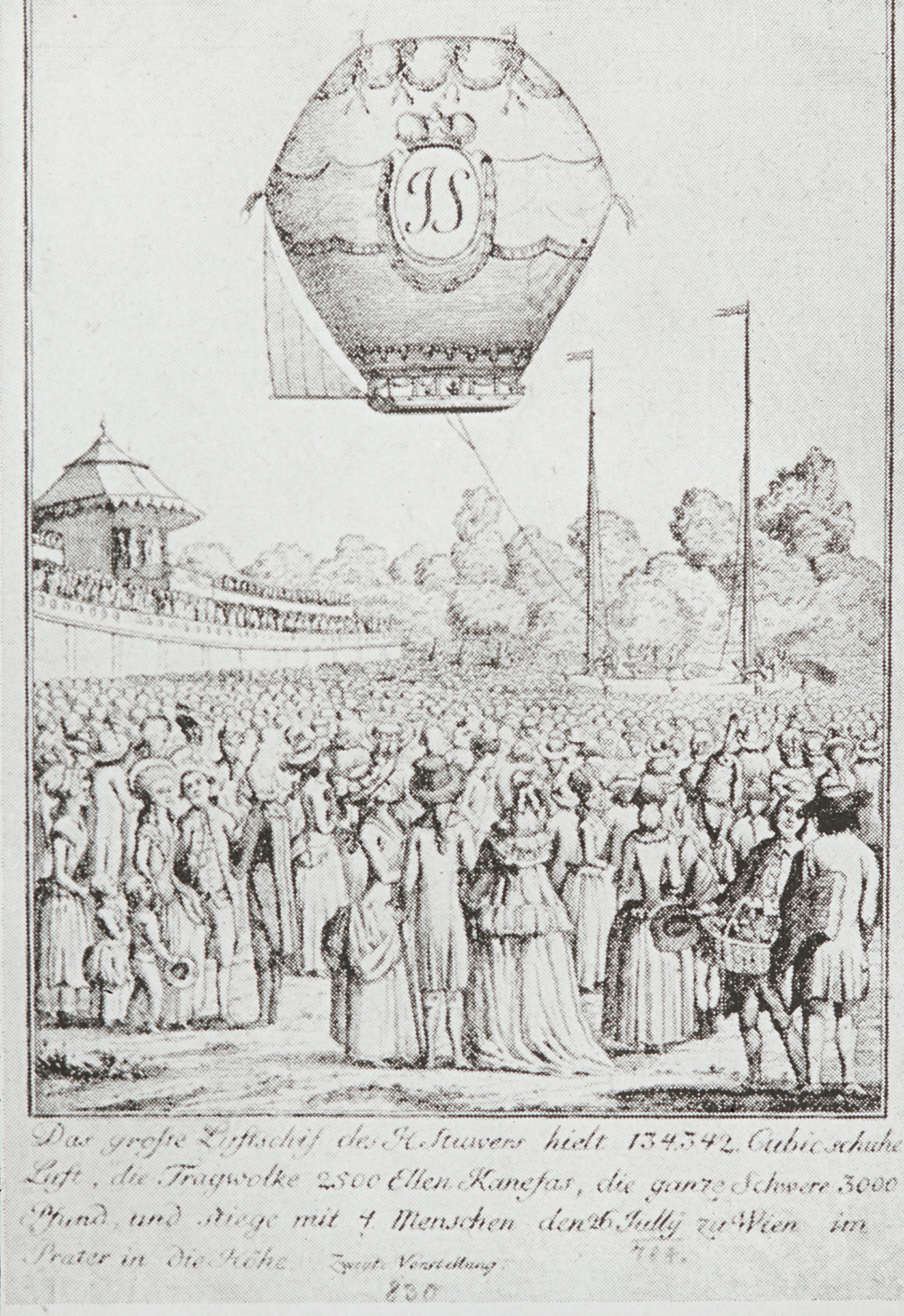 "Das grosse Luftschiff des H. Stuwers hielt 134.342 Cubicschuhe Luft, die Tragwolke 2500 Ellen Kanefas, die ganze Schwere 3000 Pfund, und stiege mit 4 Menschen den 26. Jully zu Wien im Prater in die Höhe".