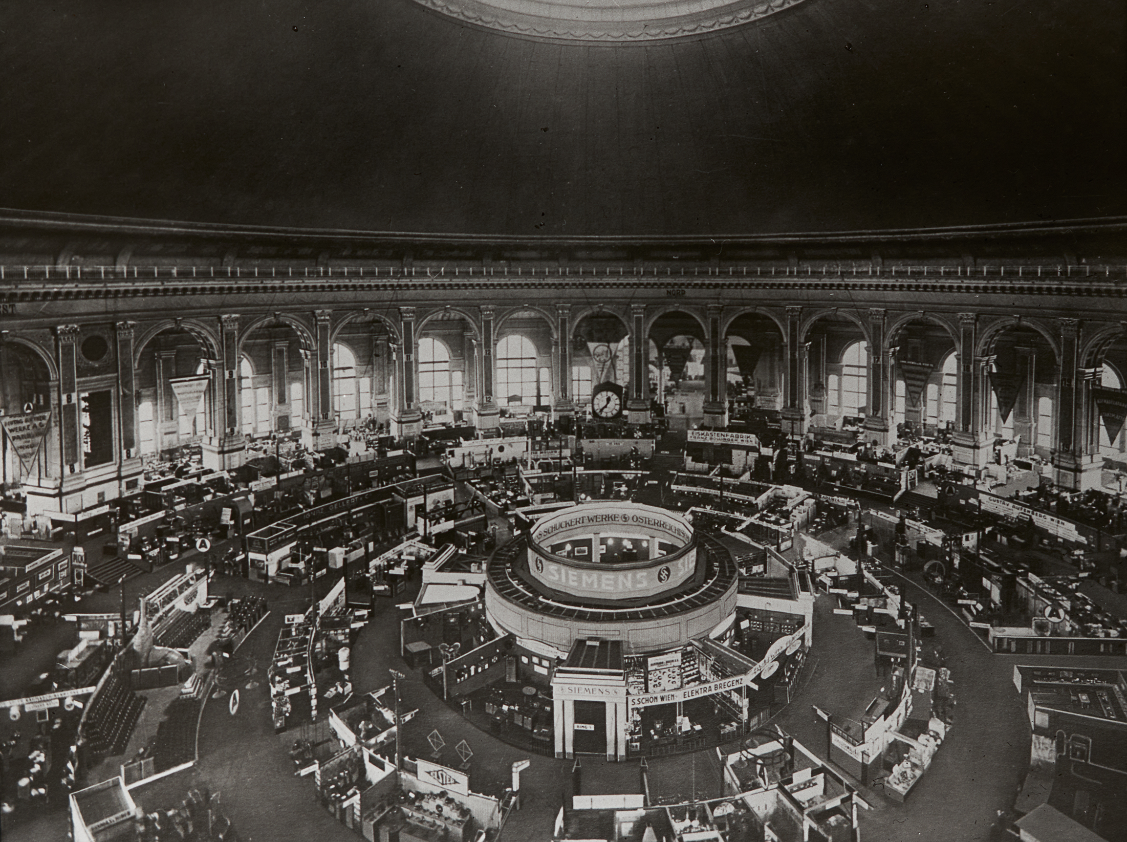 Die Rotunde im Prater, die anlässlich der Weltausstellung 1873 erbaut wurde, war ab 1921 zweimal jährlich als Messegebäude in Verwendung. Hier zu sehen ist der Innenbereich der Rotunde während einer Messe.