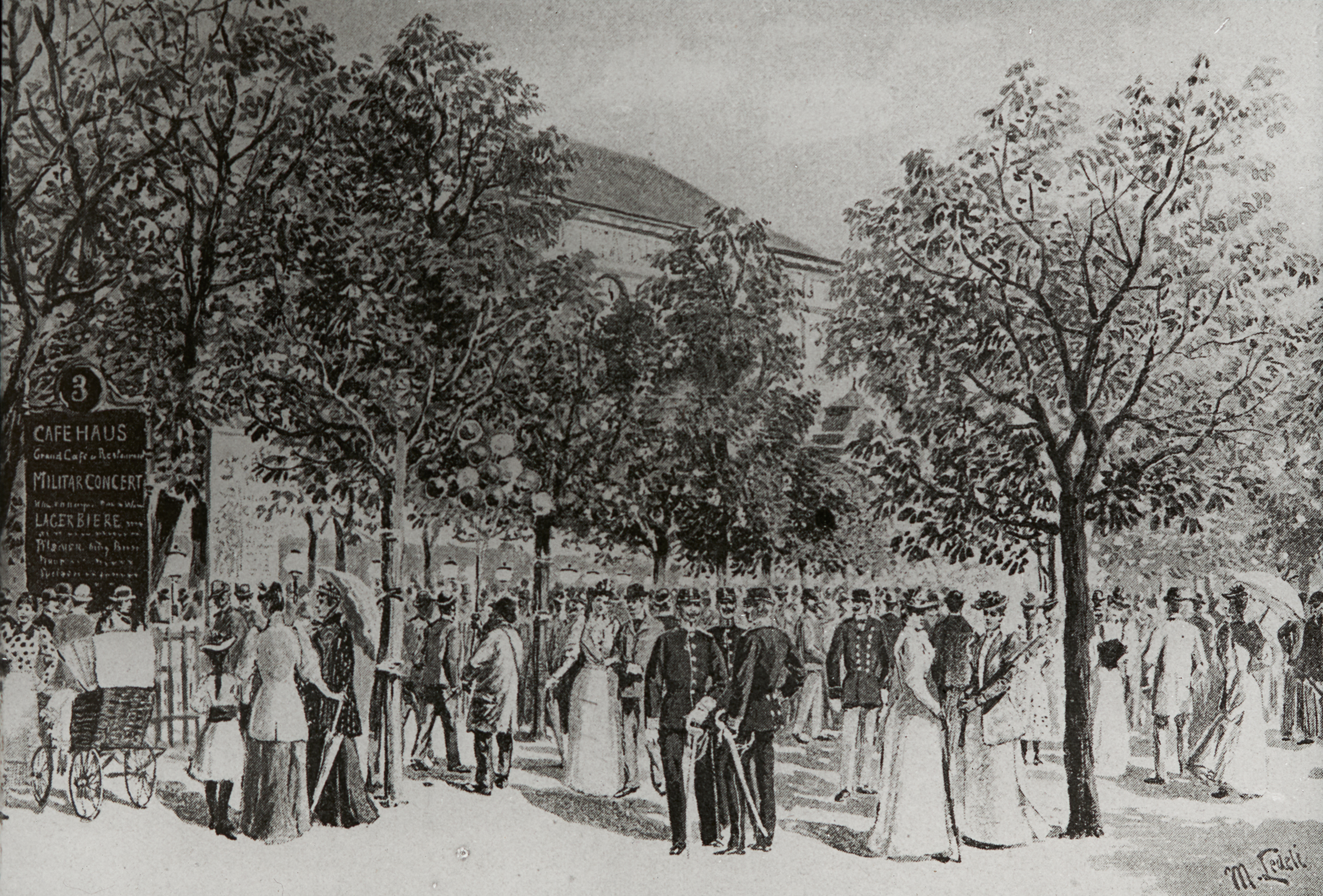 Über den gesamten Prater verteilt gab es damals Kaffeehäuser. Dort kehrten die verschiedensten Bevölkerungsgruppen ein. Am Schild des Kaffeehaus 3 beschrieben ist ein Militärkonzert.