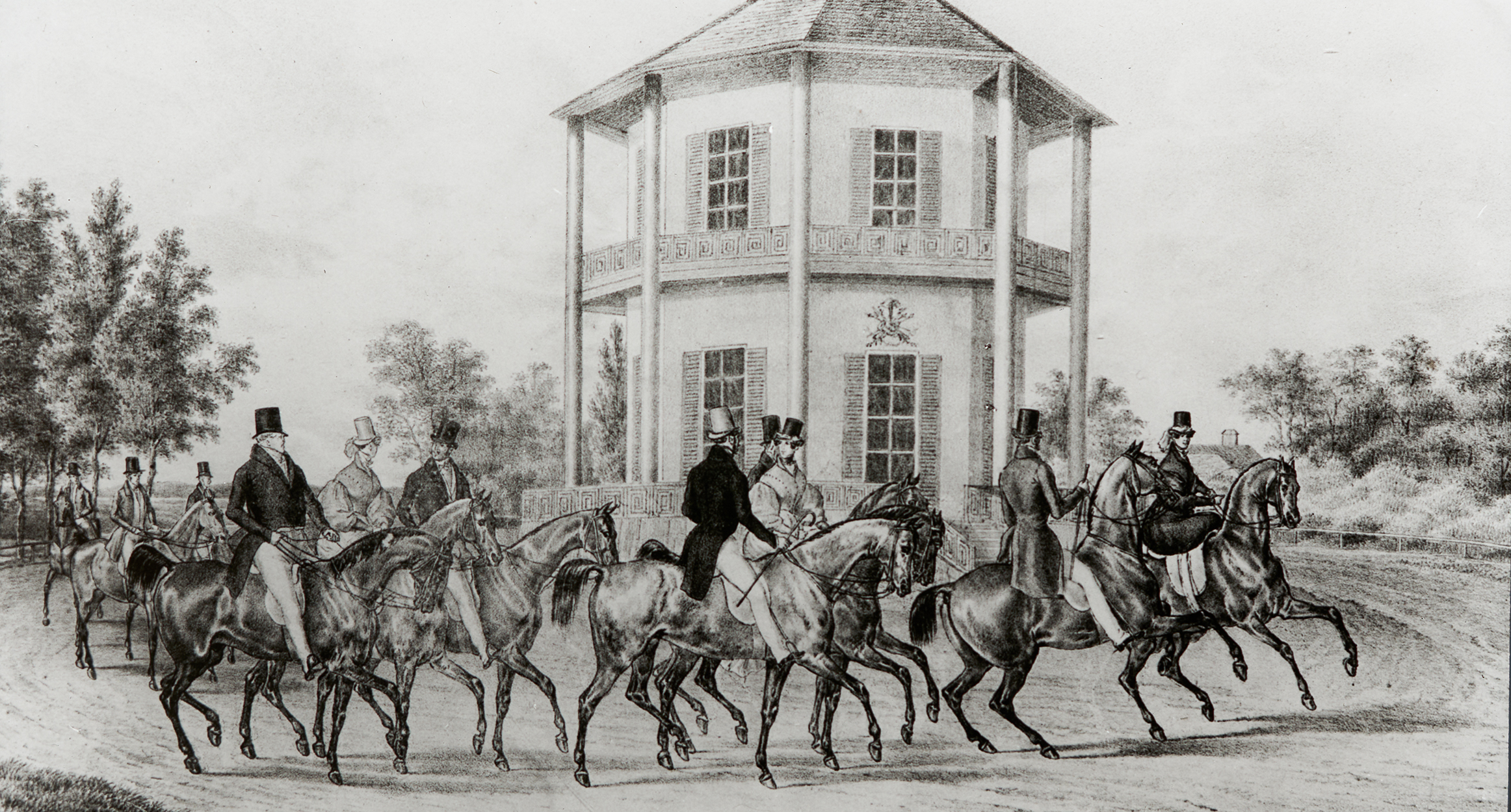 Zu sehen ist eine Gruppe von Herren, die auf Pferden am Wiener Lusthaus im Prater vorbeireiten.
