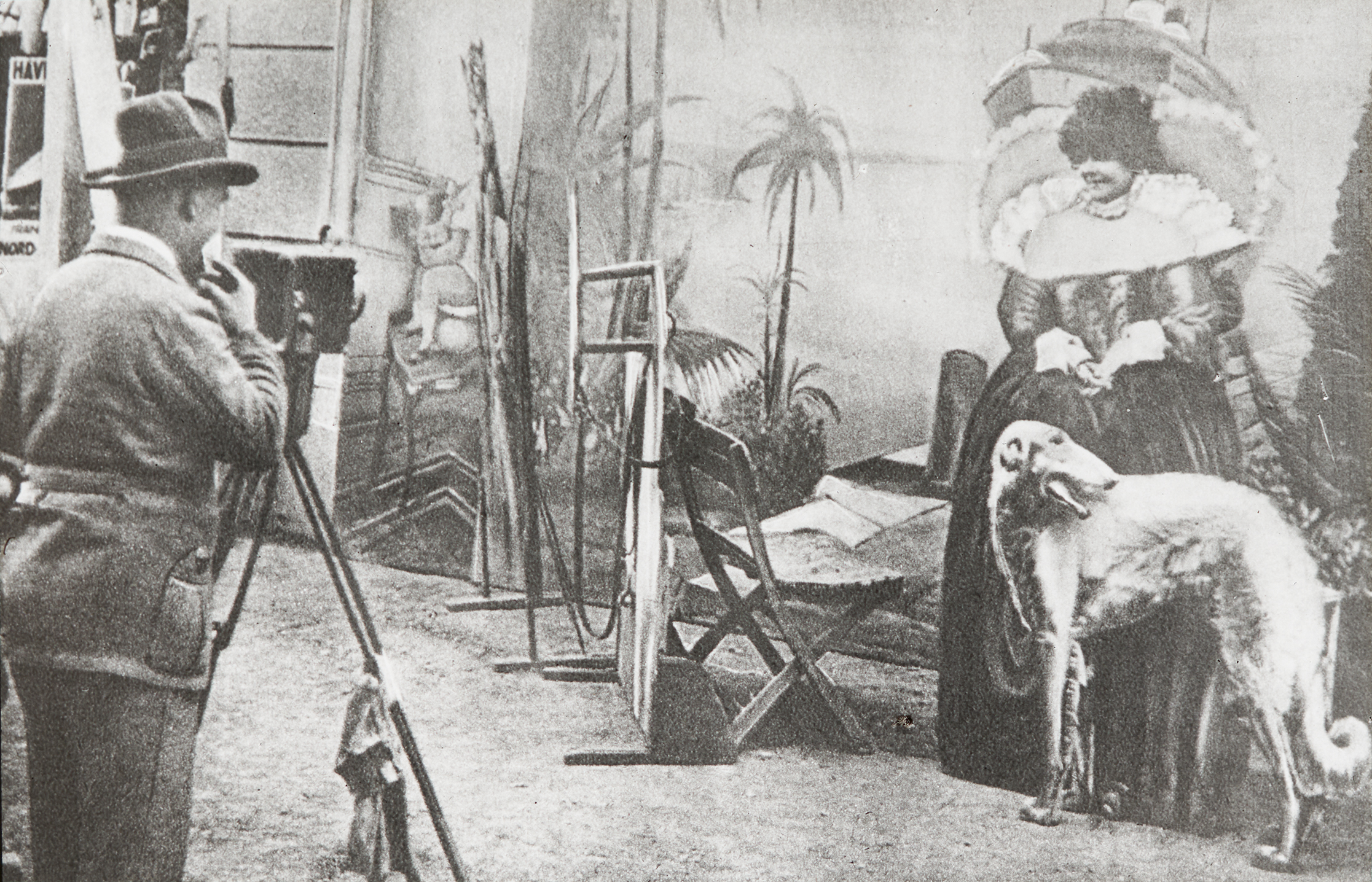 Diese Frau wird mit ihrem Hund von einem Fotografen fotografiert. Sie trägt festliche Kleidung.