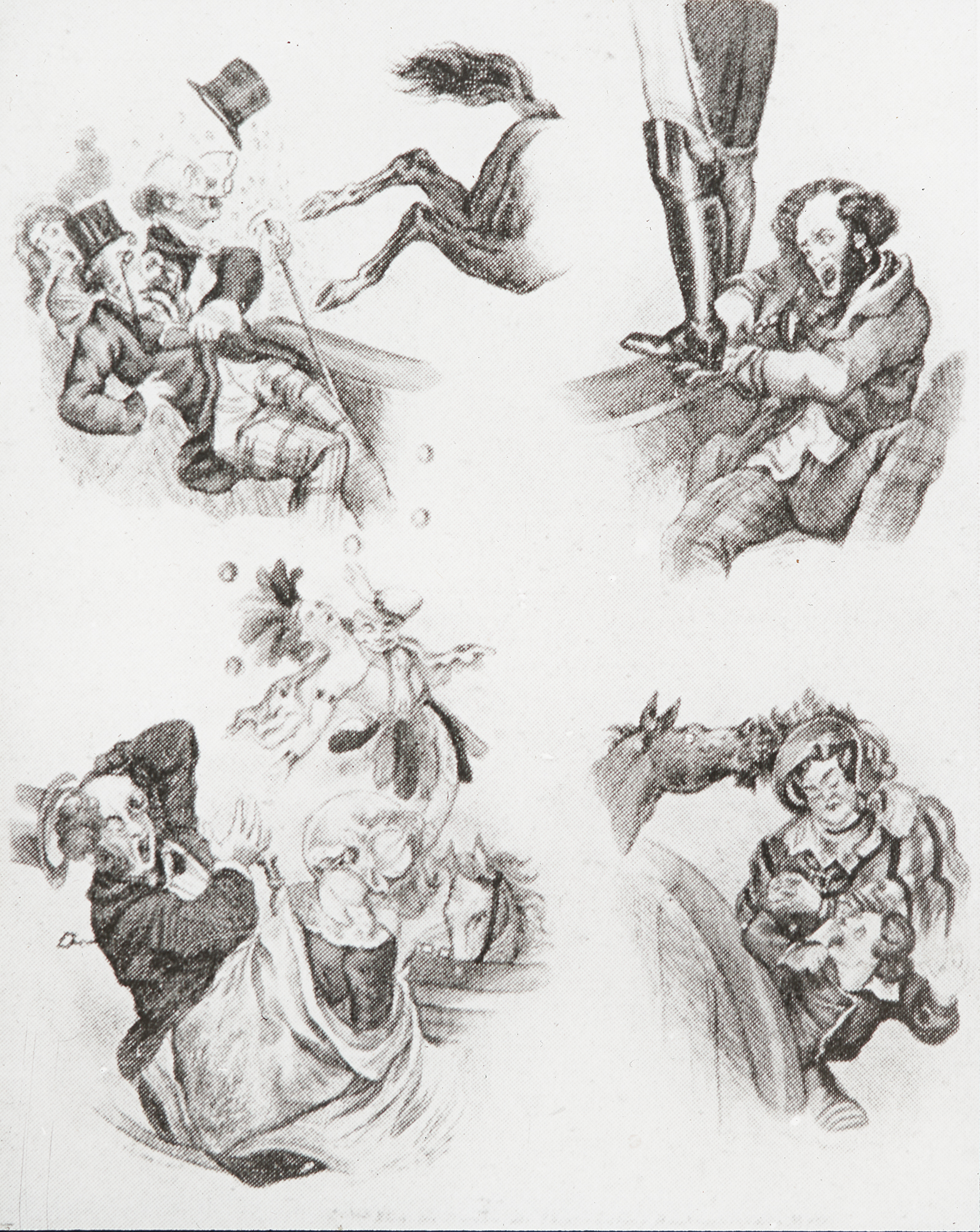 Auf diesem Bilderbogen erkennt man vier verschiedene komödiantische Karrikaturen.
