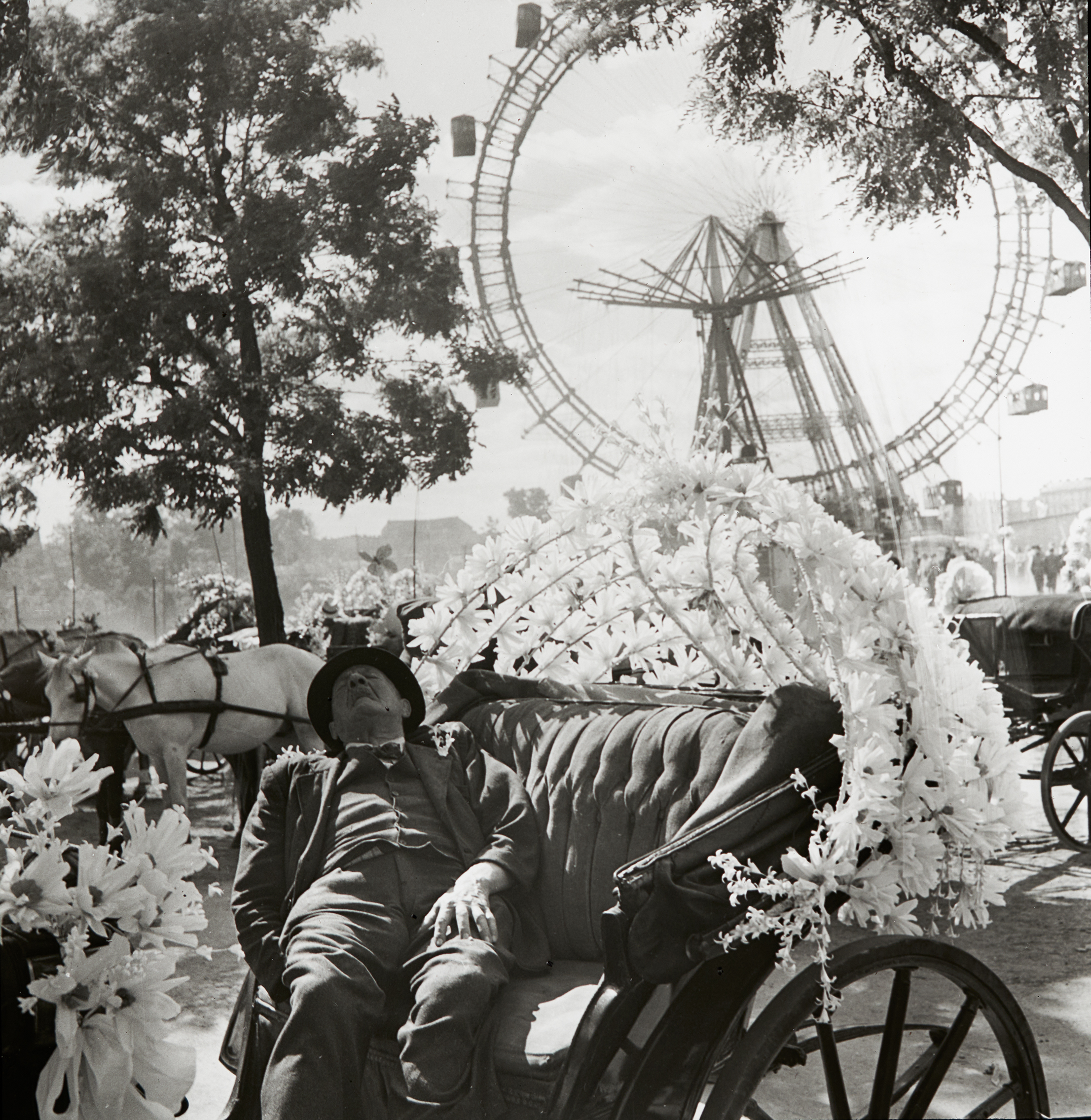 Die Tradition der Wiener Fiaker besteht schon sehr lange. Die Kutschen, die von Pferden gezogen werden, ziehen oft durch den ersten und zweiten Bezirk. Hier ist ein Mann zu sehen, der auf der Bank eines Fiakers schläft. Im Hintergrund erkennt man das Wiener Riesenrad.
