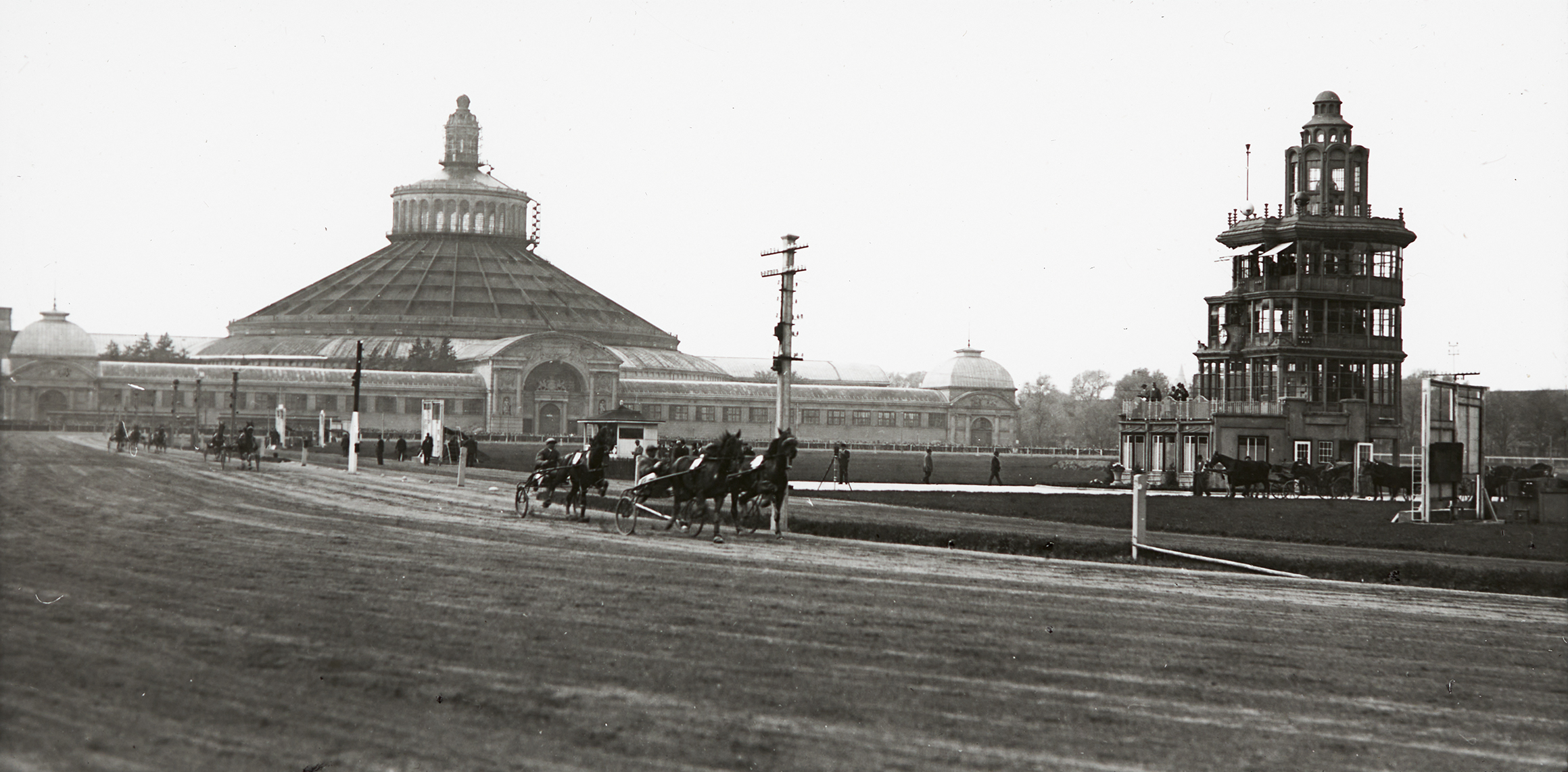 Vom Trabrennplatz aus hatte man einen guten Blick auf die Rotunde im Prater. Der Trabrennplatz war eine Pferderennbahn mit einer Länge von 1100 Metern.
