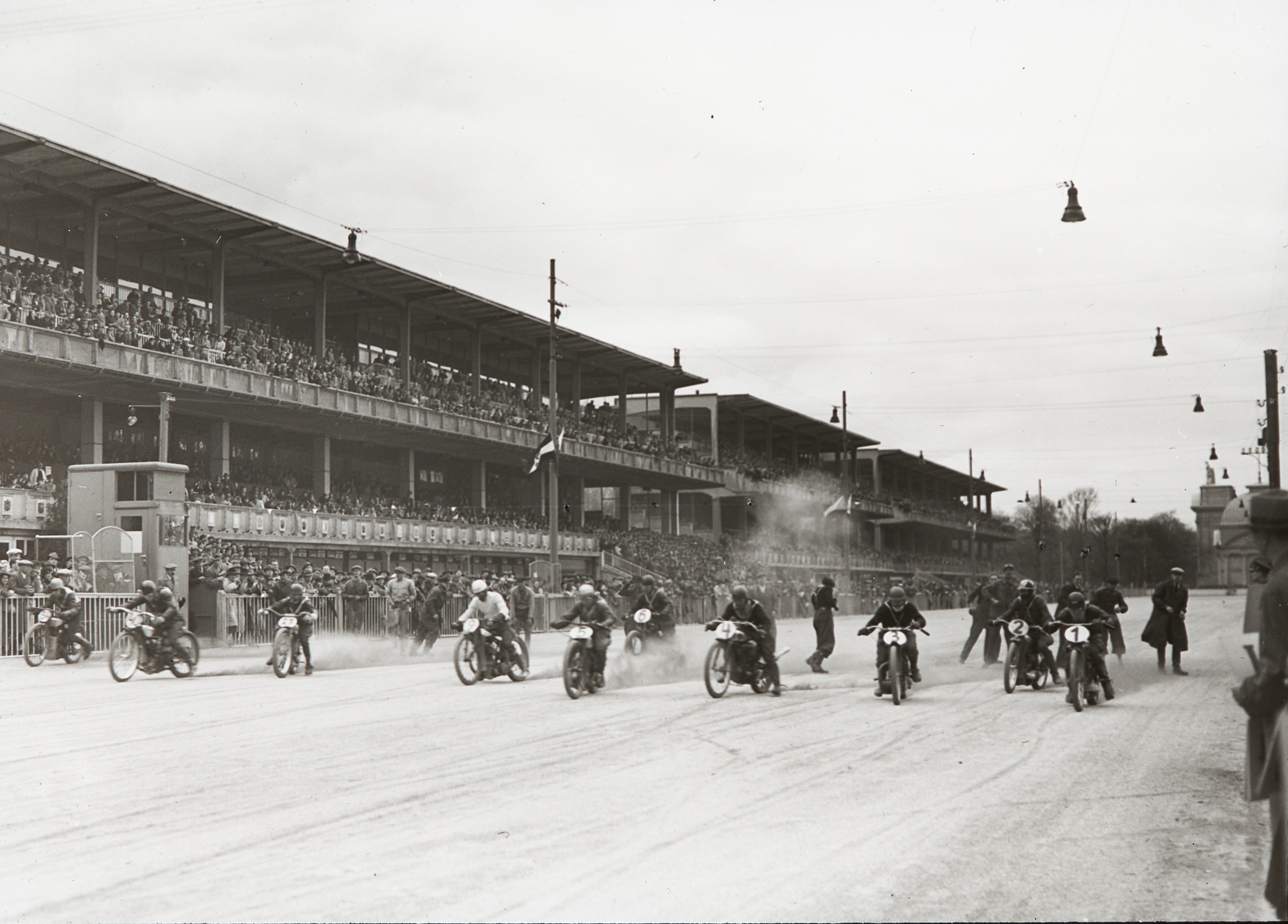 Der Trabrennplatz wurde auch für Motorradrennen verwendet. An der Seite erkennt man die vollen Ränge der Tribünen, in denen das Publikum während der Rennen Platz fand.