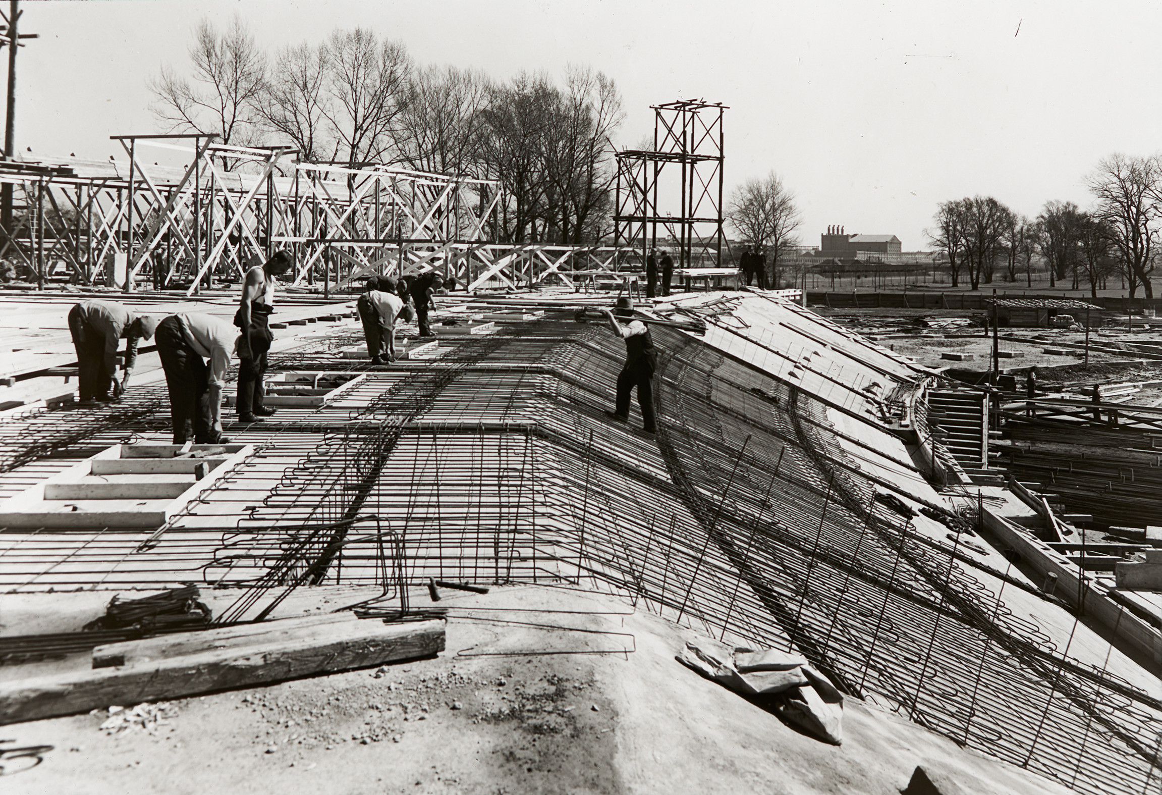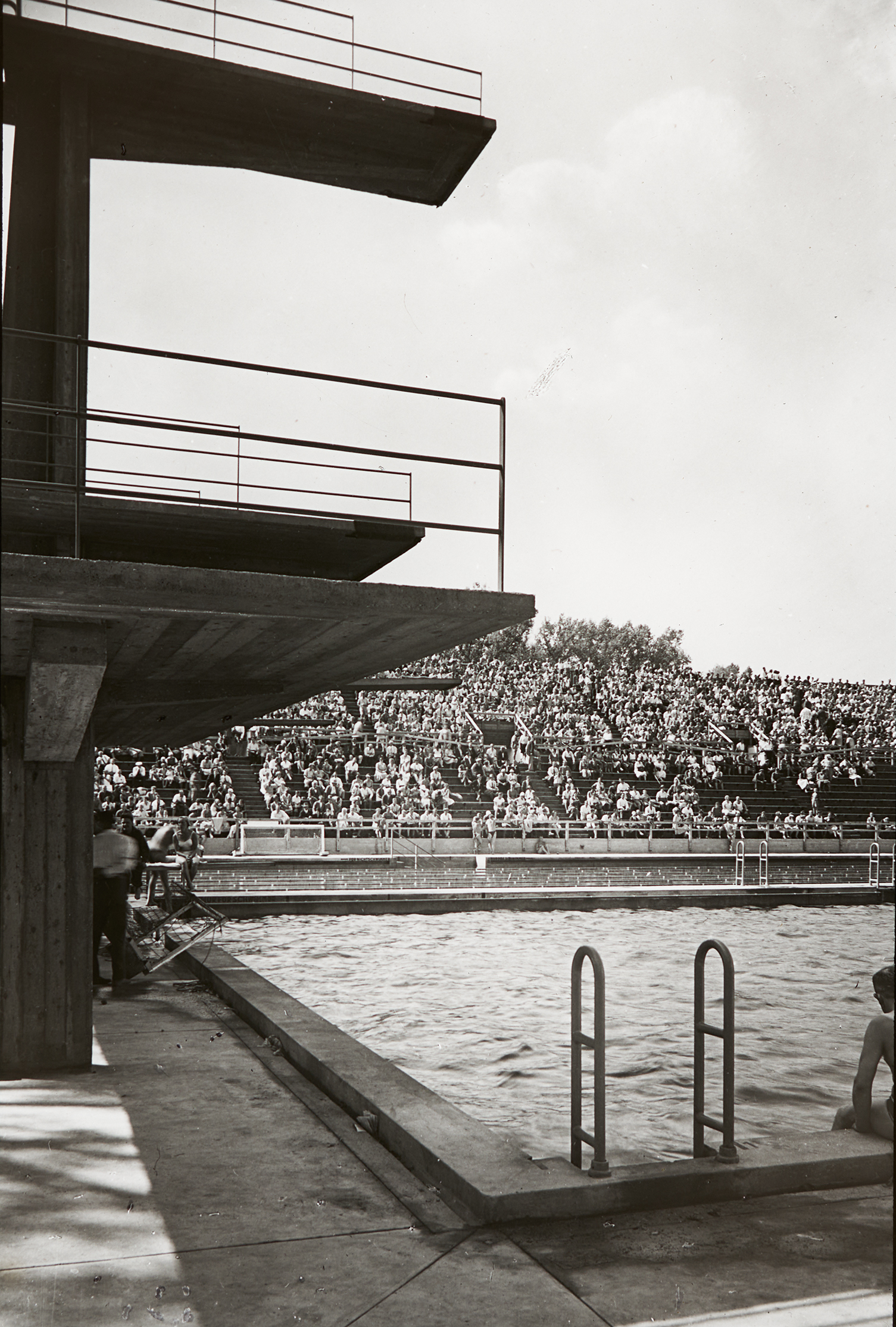 Das Stadionbad wurde von 1929 bis 1931 erbaut. Es befindet sich im zweiten Wiener Gemeindebezirk. Hier ist das Publikum bei einer Veranstaltung von den Sprungtürmen aus zu sehen.